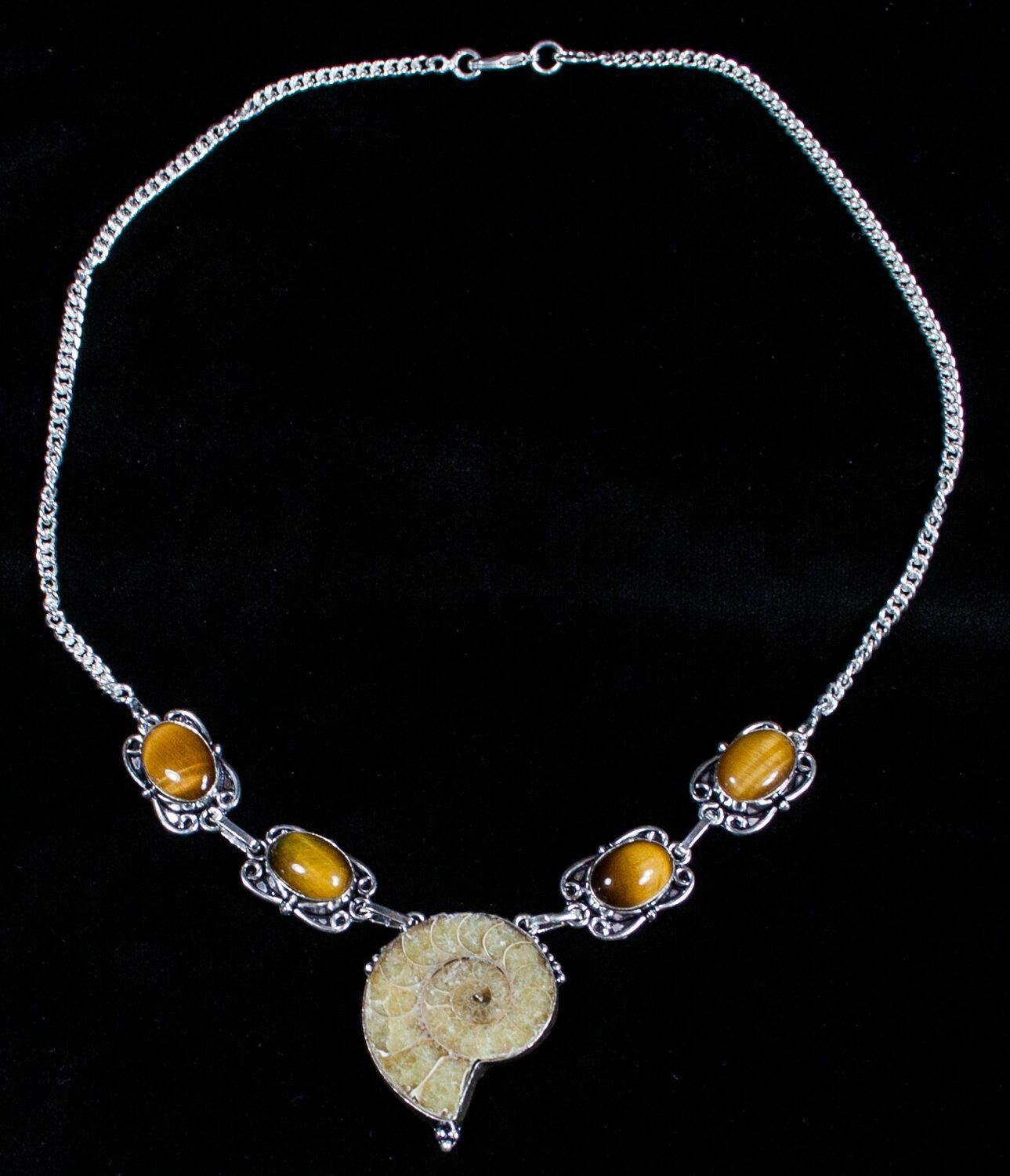 Here is a unique piece of jewelry featuring real cut and polished ammonite fossils from Madagascar and polished tiger eye. The necklace itself is 16 inches in length.