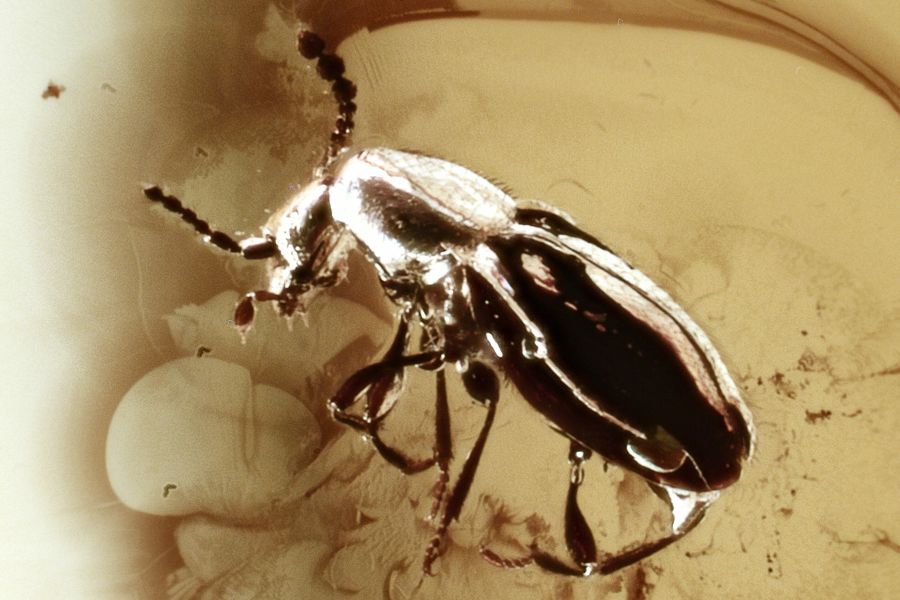 Beetle is about 1mm, Amber 10 x 8 x 5mm