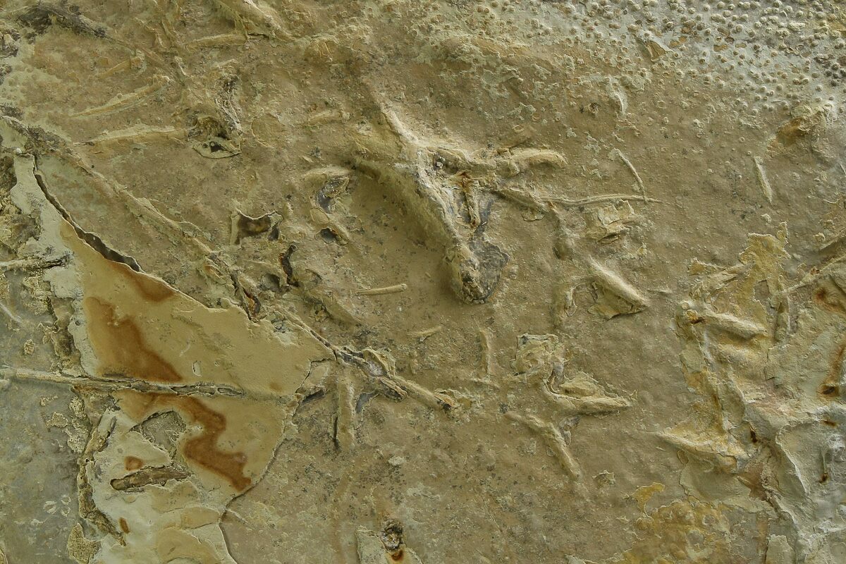 The site also preserves fascinating behavioral evidence, including feeding traces that capture birds actively foraging in the soft sediment. Some traces consist of a series of scoops made as birds “shoveled” through the mud with their beaks in search of insects, while others show U-shaped channels formed by the tip of a beak dragged through the sediment as a bird walked backward while feeding. In addition to bird activity, the horizon contains ancient insect traces such as Cochlichnus, interpreted as nematode trails that appear as delicate, squiggly lines, as well as tiny round footprints likely made by flies or beetles, often found within trample zones. Even non-biological ichnofossils are preserved, including round, uniform raindrop impressions that fell during the early Eocene and splash droplets created by birds running or hopping through shallow water. Together, these traces create a vivid snapshot of a dynamic lakeshore ecosystem frozen in time.