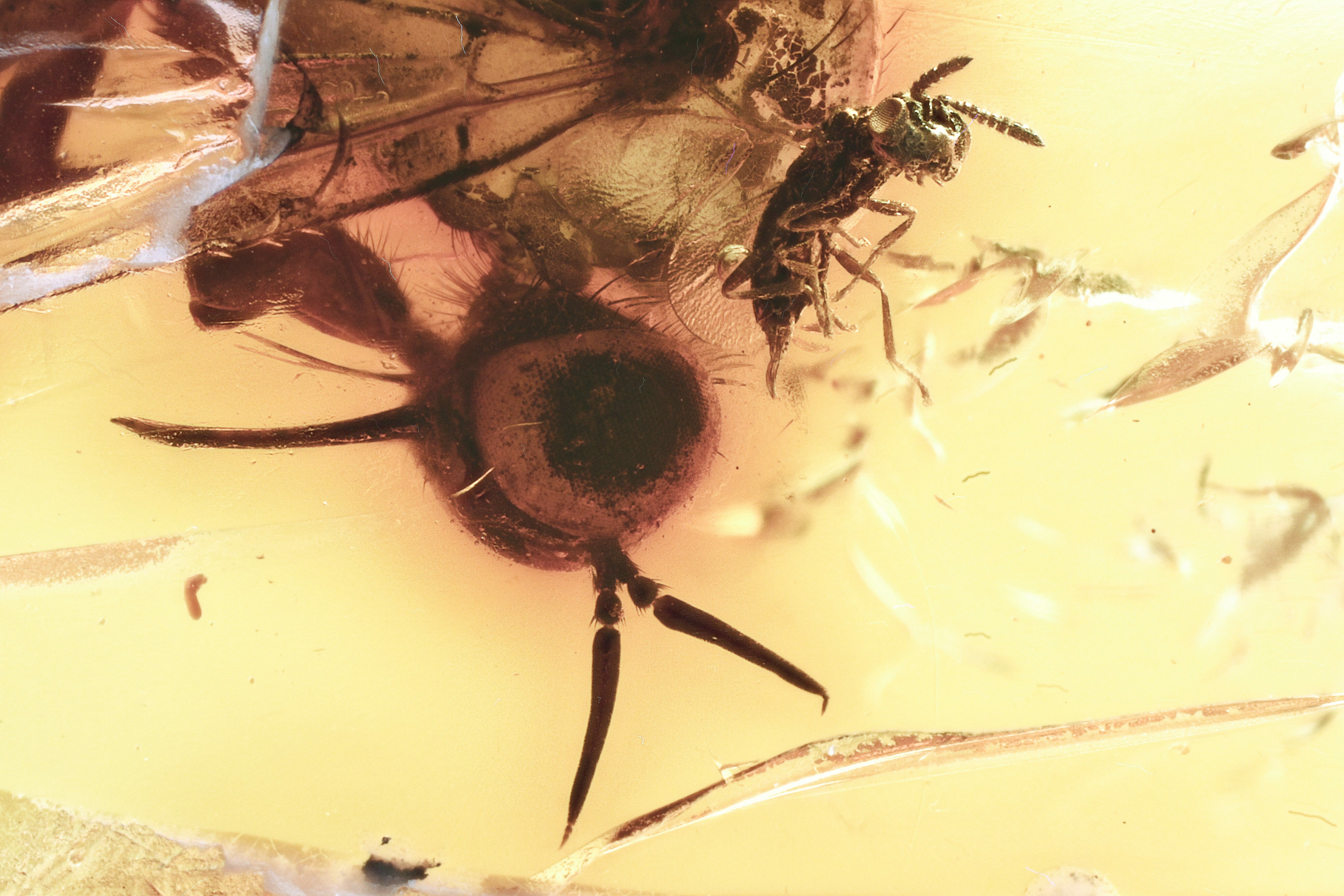 This is a detailed 44 million year old fossil chalcid wasp (order Hymenoptera - superfamily Chalcidoidea) preserved alongside a scuttle fly (family Phoridae), a true midge (family Chironomidae), and the head of a dagger fly (family Empididae) preserved in Baltic amber.