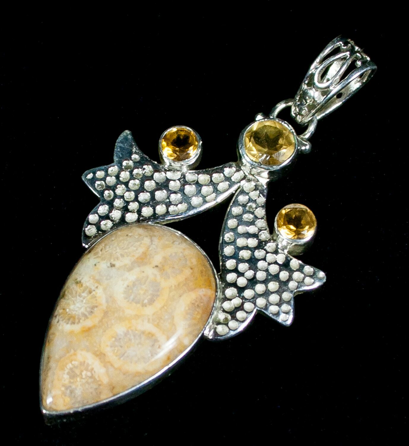 This is a pendant made from agatized, fossil coral from Sumatra, Indonesia. The polishing allows the beautiful, fossilized structure of the coral heads to easily be seen. The setting has been created using .925 sterling silver.