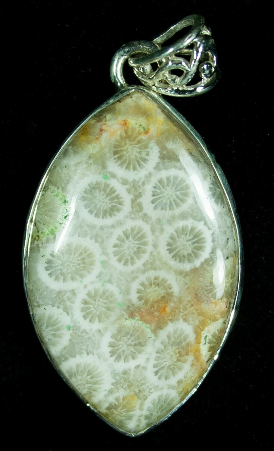 This is a pendant made from agatized, fossil coral from Sumatra, Indonesia. The polishing allows the beautiful, fossilized structure of the coral heads to easily be seen. The setting has been created using .925 sterling silver.