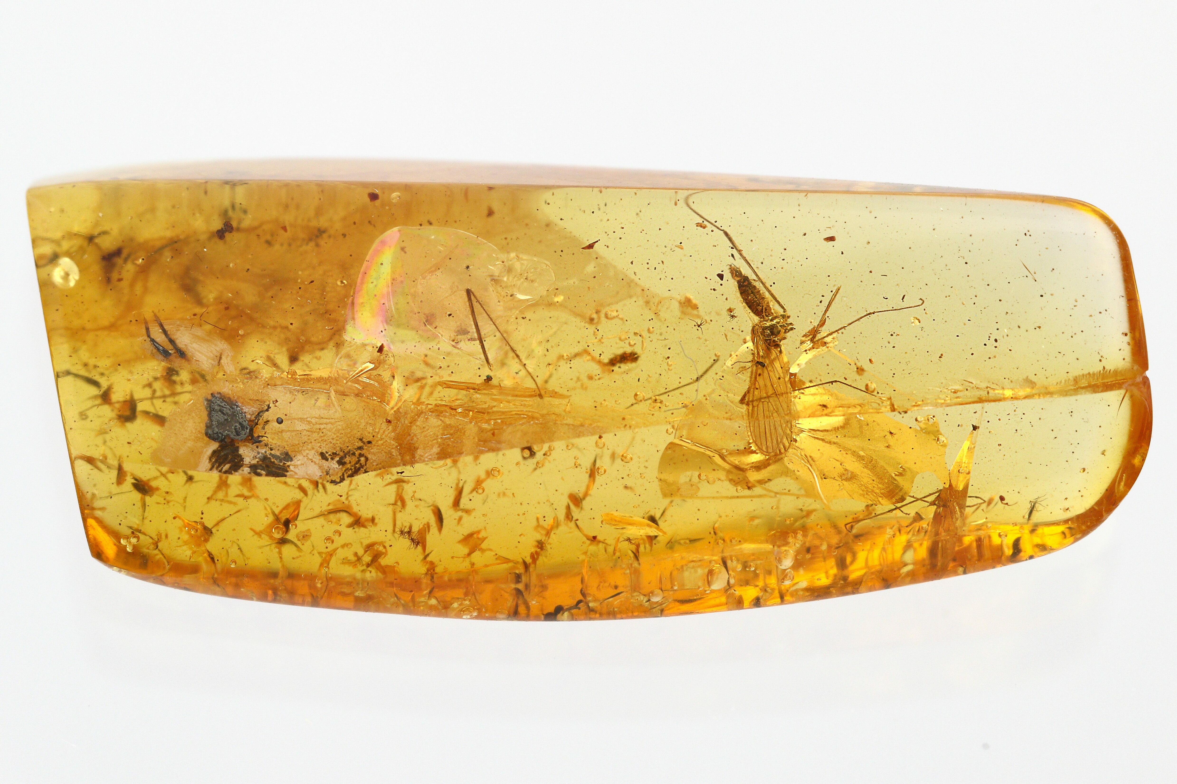 This piece of 44 million year old Baltic amber contains a nicely preserved crane fly from the subfamily Limoniidae. The crane fly measures approximately 5mm long (including legs and wings) and most of its legs became disarticulated and lost prior to preservation.