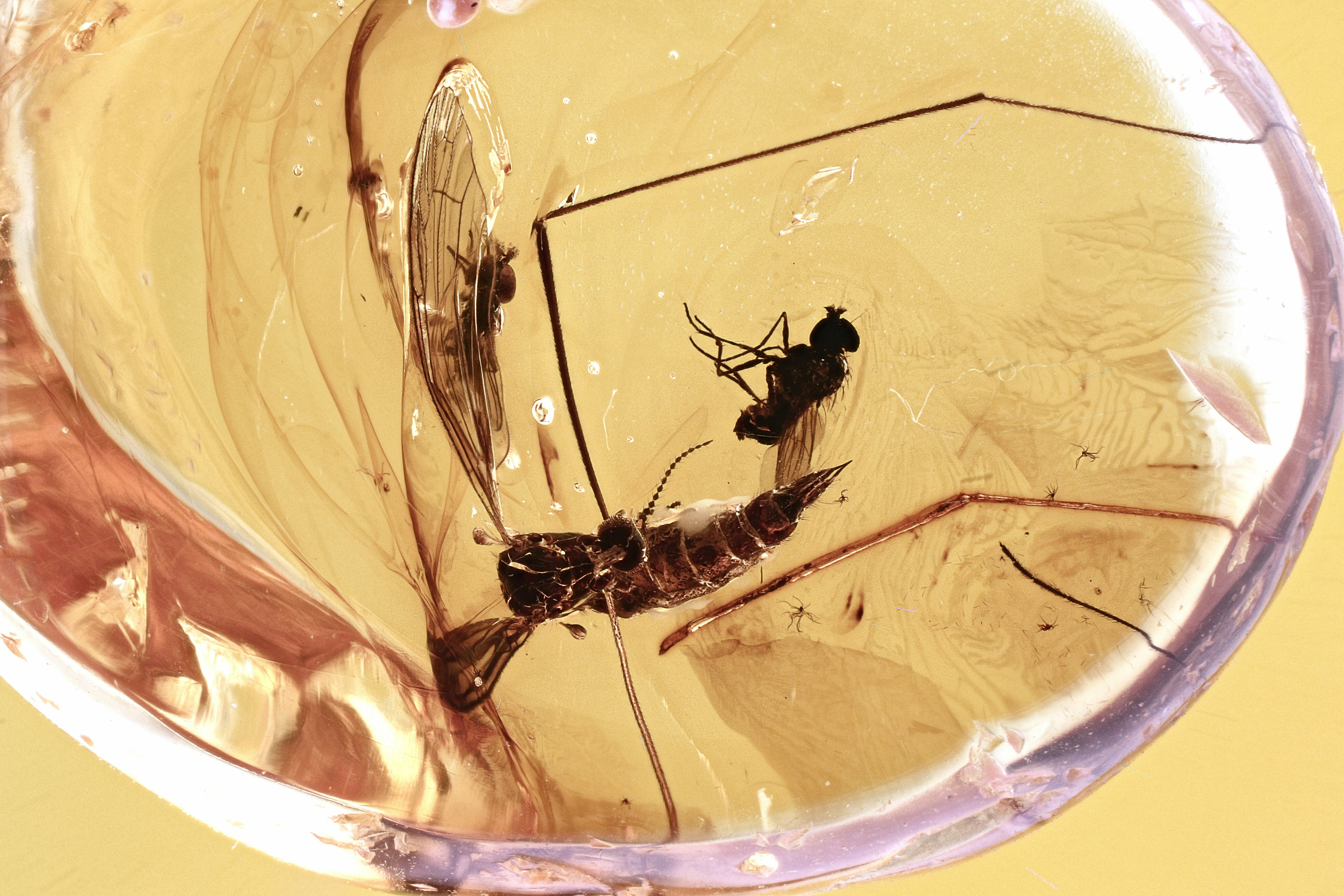 This piece of 44 million year old Baltic amber contains a crane fly from the subfamily Limoniidae preserved alongside two long-legged flies (order Diptera - family Dolichopodidae). The crane fly measures approximately 8.8mm long (including legs and wings) and most of its legs became disarticulated and lost prior to preservation.