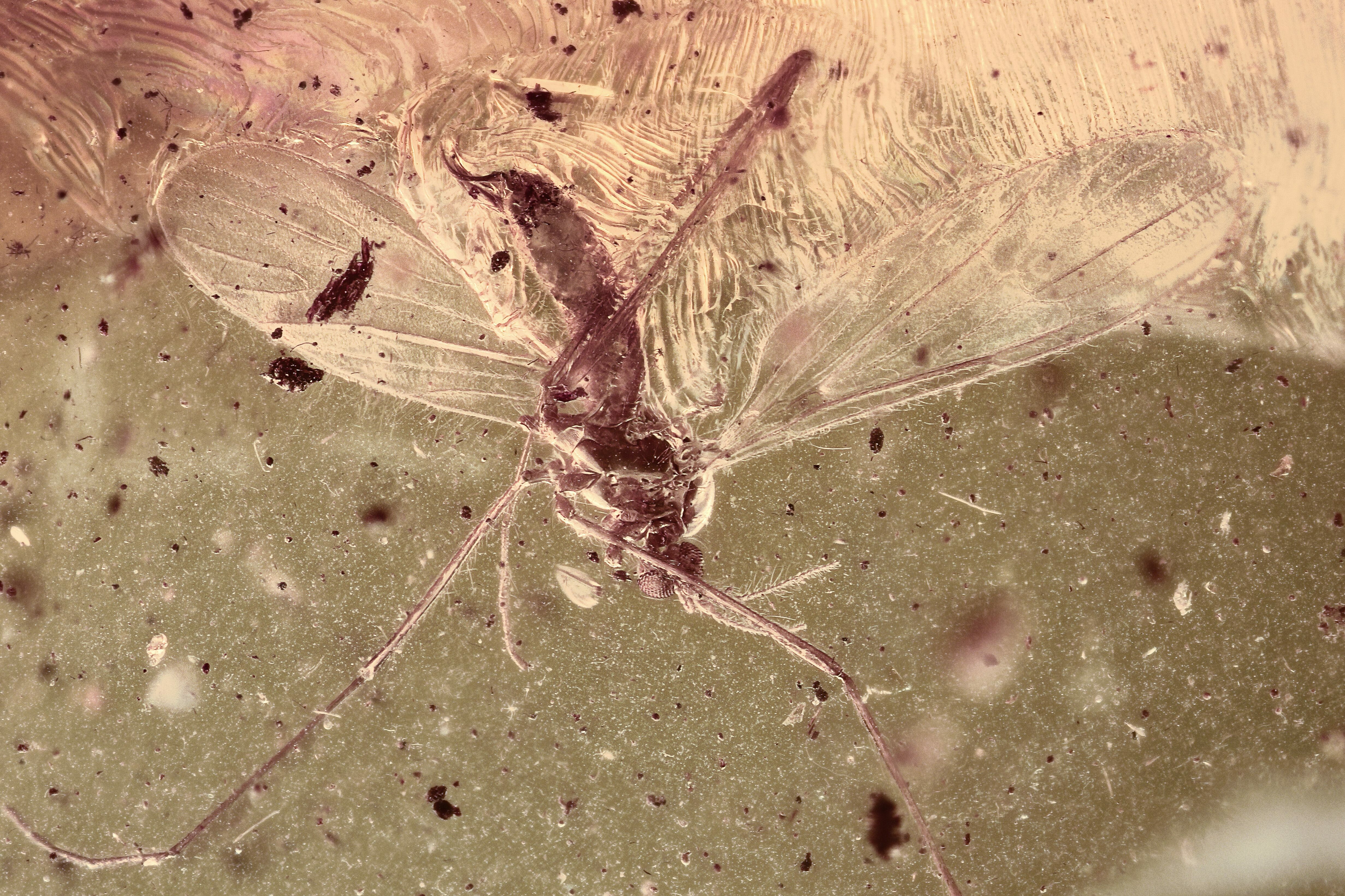 This piece of 44 million year old Baltic amber contains a small but detailed crane fly of the family Limoniidae preserved alongside two spiders (order Araneae). The largest spider measures approximately 4.5mm wide including appendages.