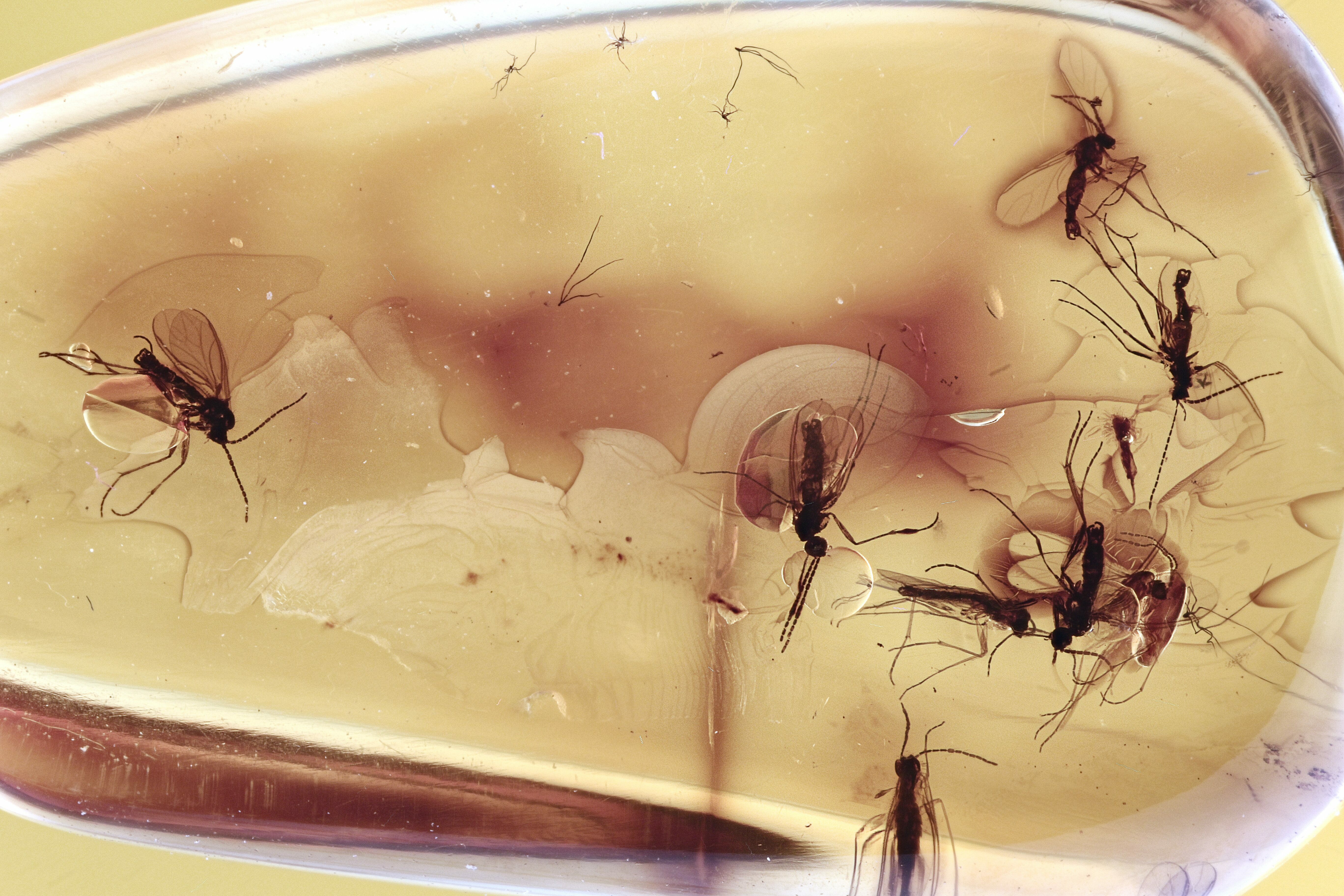 This is a beautifully detailed 44 million year old swarm of eightfossil dark-winged fungus gnats (order Diptera - family Sciaridae) preserved alongside a springtail (class Collembola) in Baltic amber.