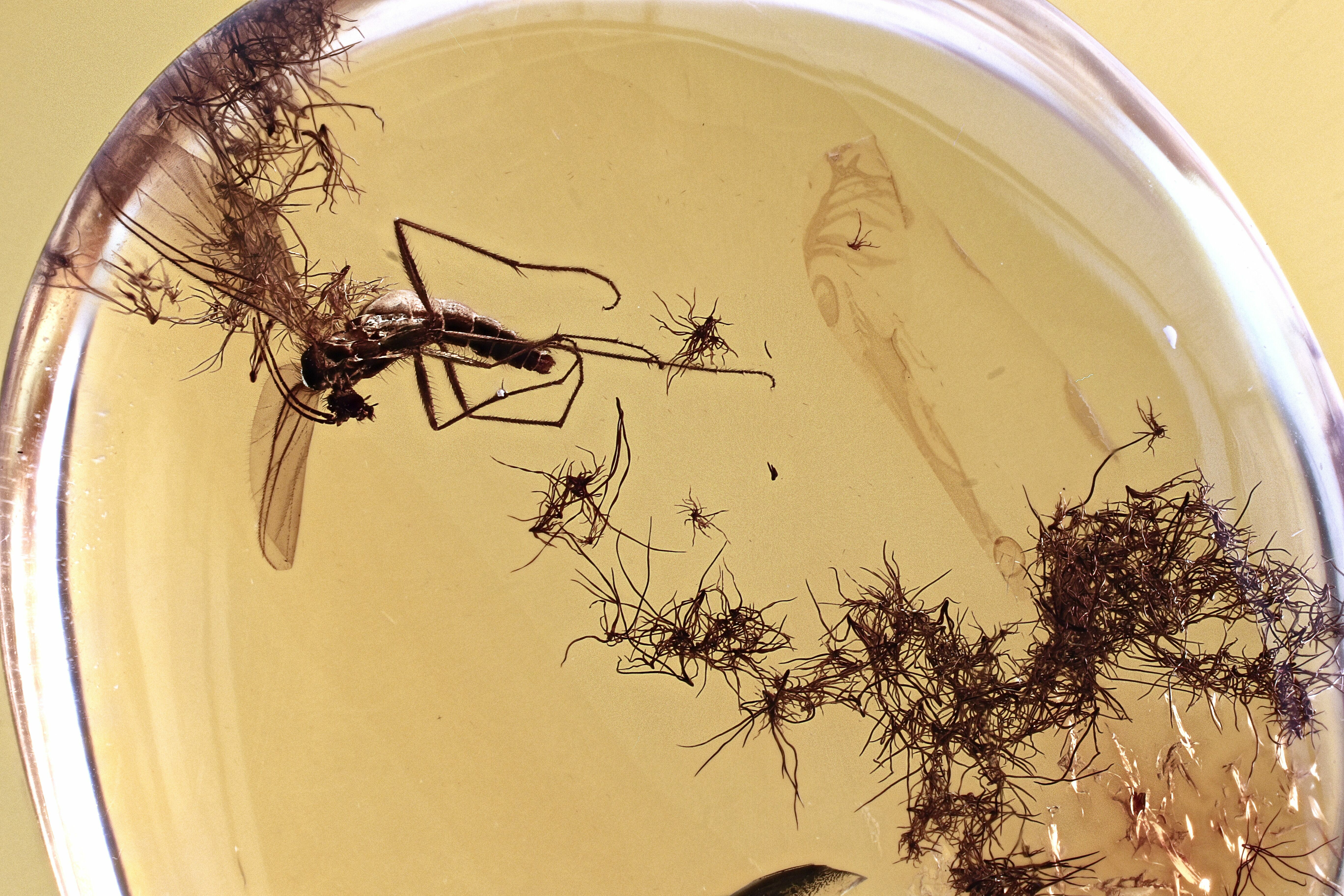 This is a detailed, 44 million year old fossil fungus gnat (order Diptera - family Mycetophilidae) preserved alongside clouds of oak stellate hairs (Quercus sp.) preserved in Baltic amber.