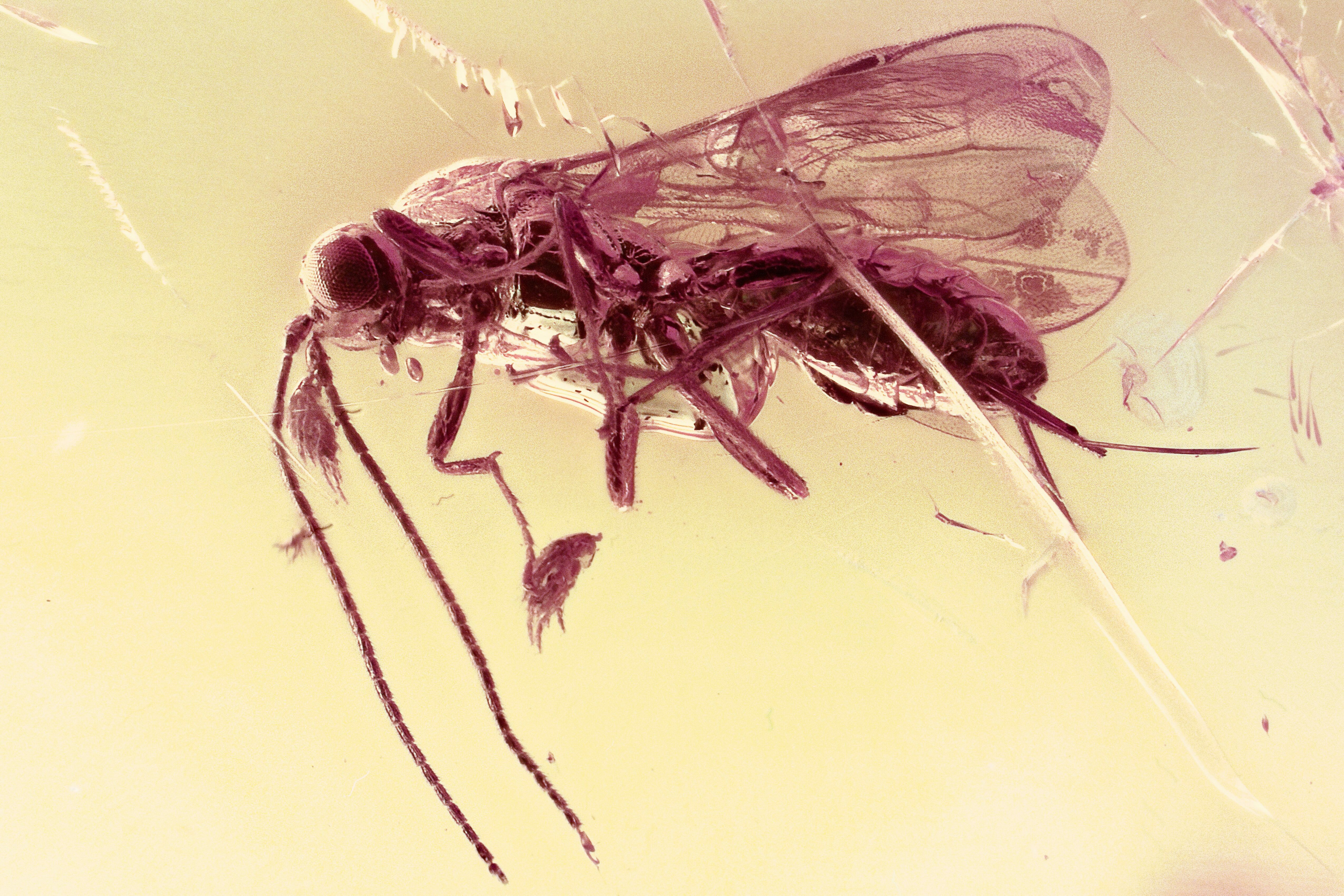 This is a 44 million year old fossil ichneumon wasp (superfamily Ichneumonoidea) preserved in Baltic amber. The length of the wasp including appendages is about 2.2mm.