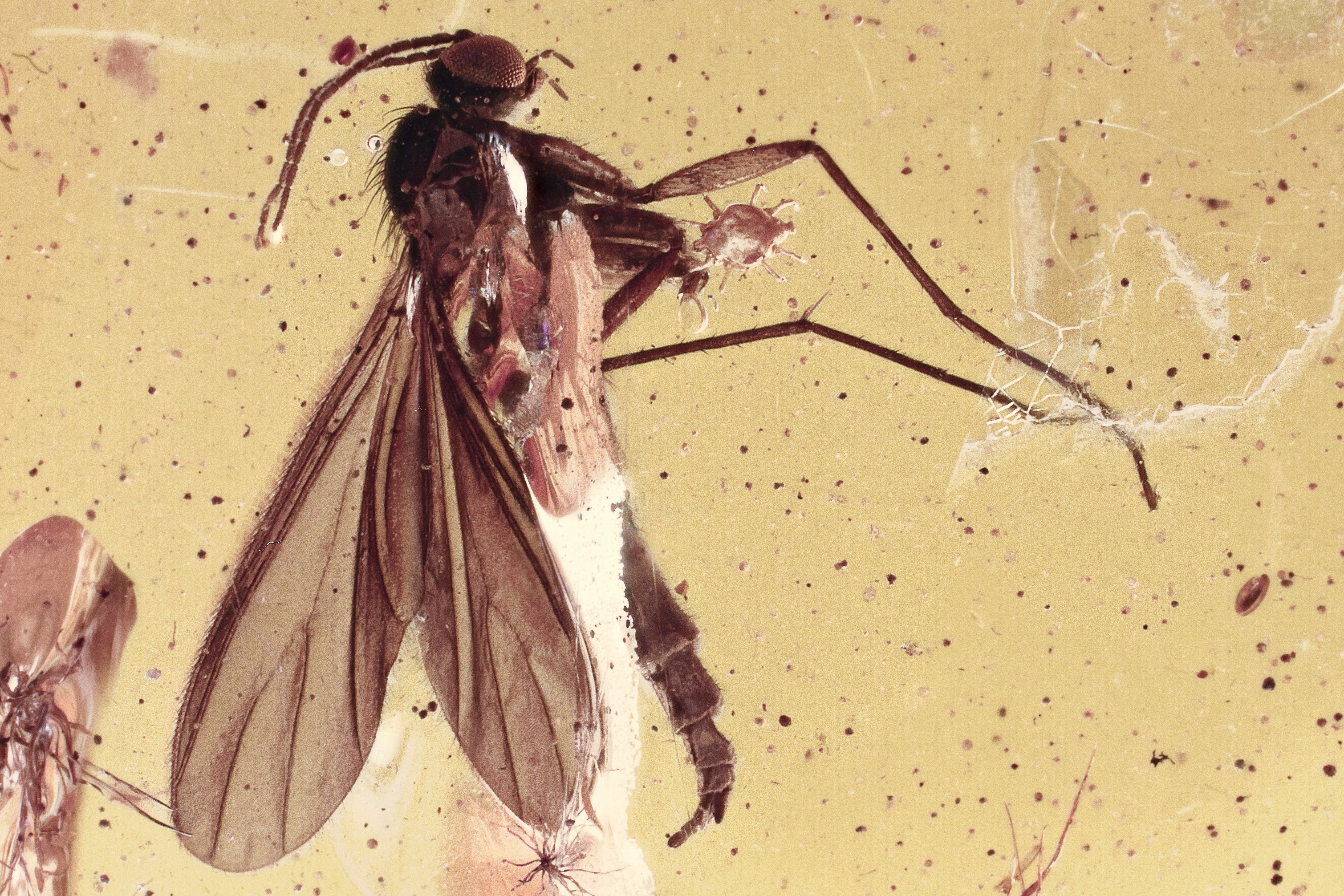 This is a 44 million year old fossil mite (subclass Acari) preserved alongside a dark-winged fungus gnat (family Sciaridae) within Baltic amber. There is an additional fly, though it's running off the edge of the amber.