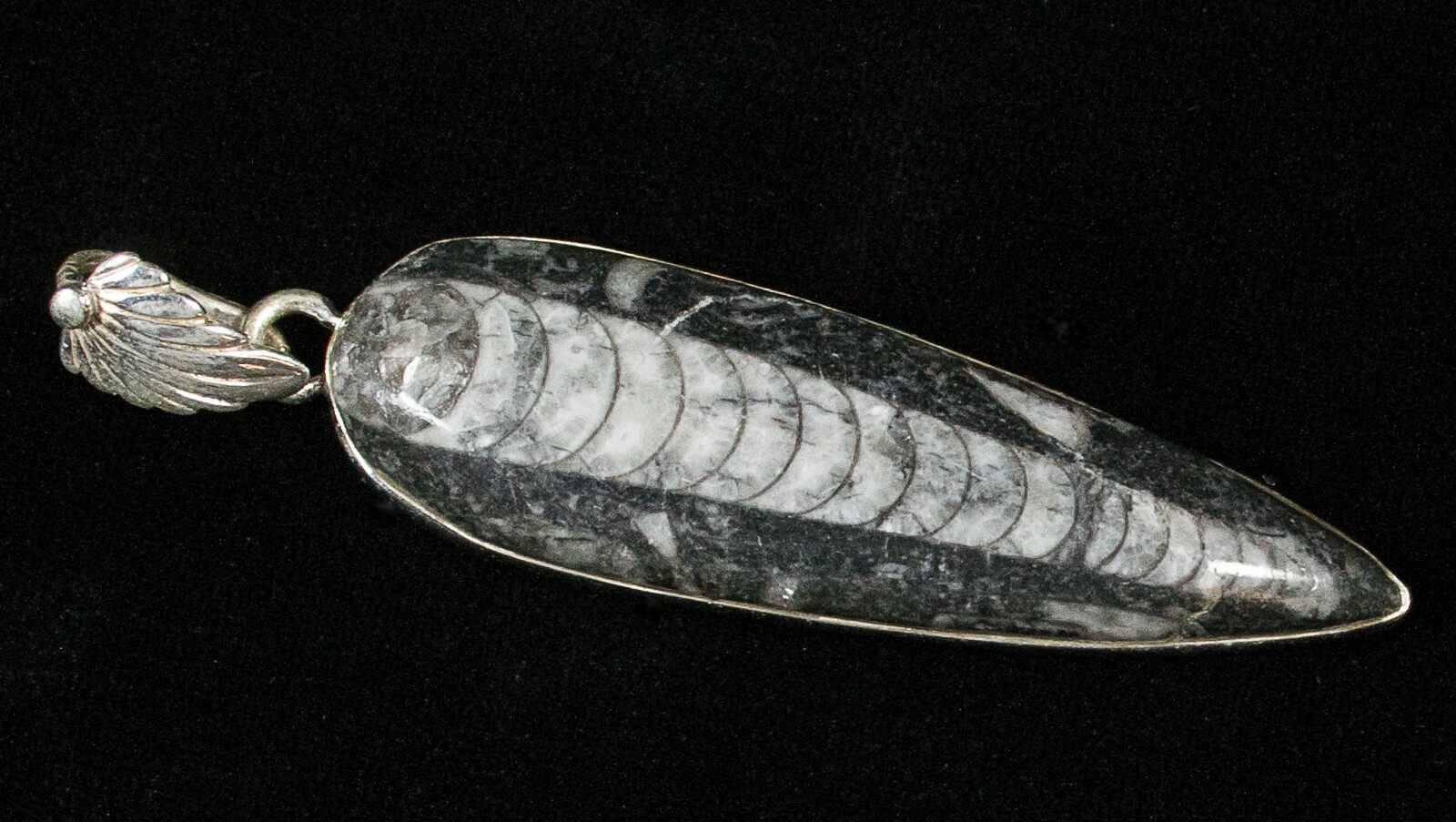 This is a beautiful handcrafted pendant featuring a real, polished, 400 million year old Orthoceras fossil from Morocco. This 2.2" long polished fossil has been set in a sterling silver setting.