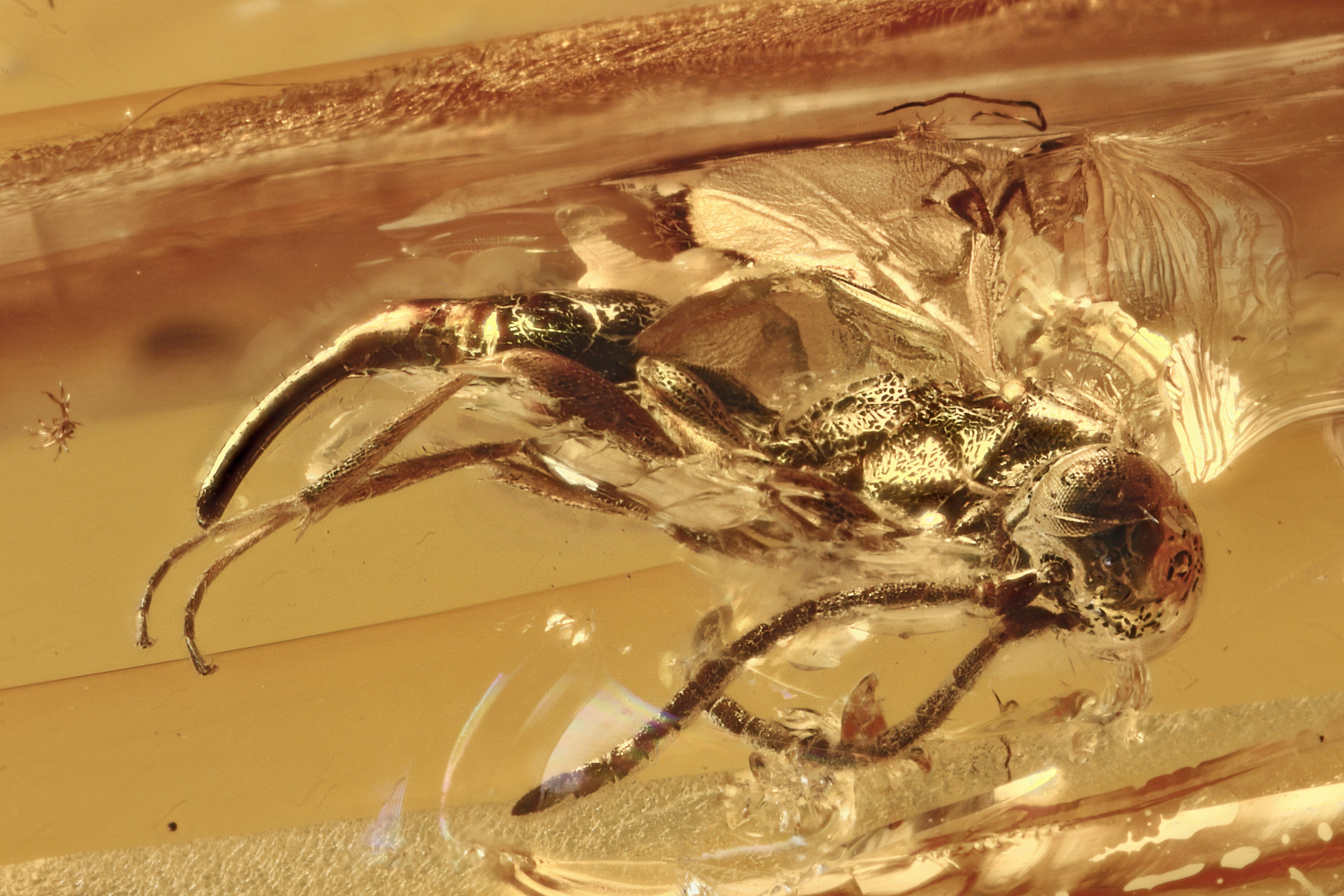This is a detailed 44 million year old fossil parasitoid wasp (family Proctotrupidae) preserved in Baltic amber. The length of the wasp is about 2.8mm and two bonus flies (order Diptera) can be found running off the edge of the amber.