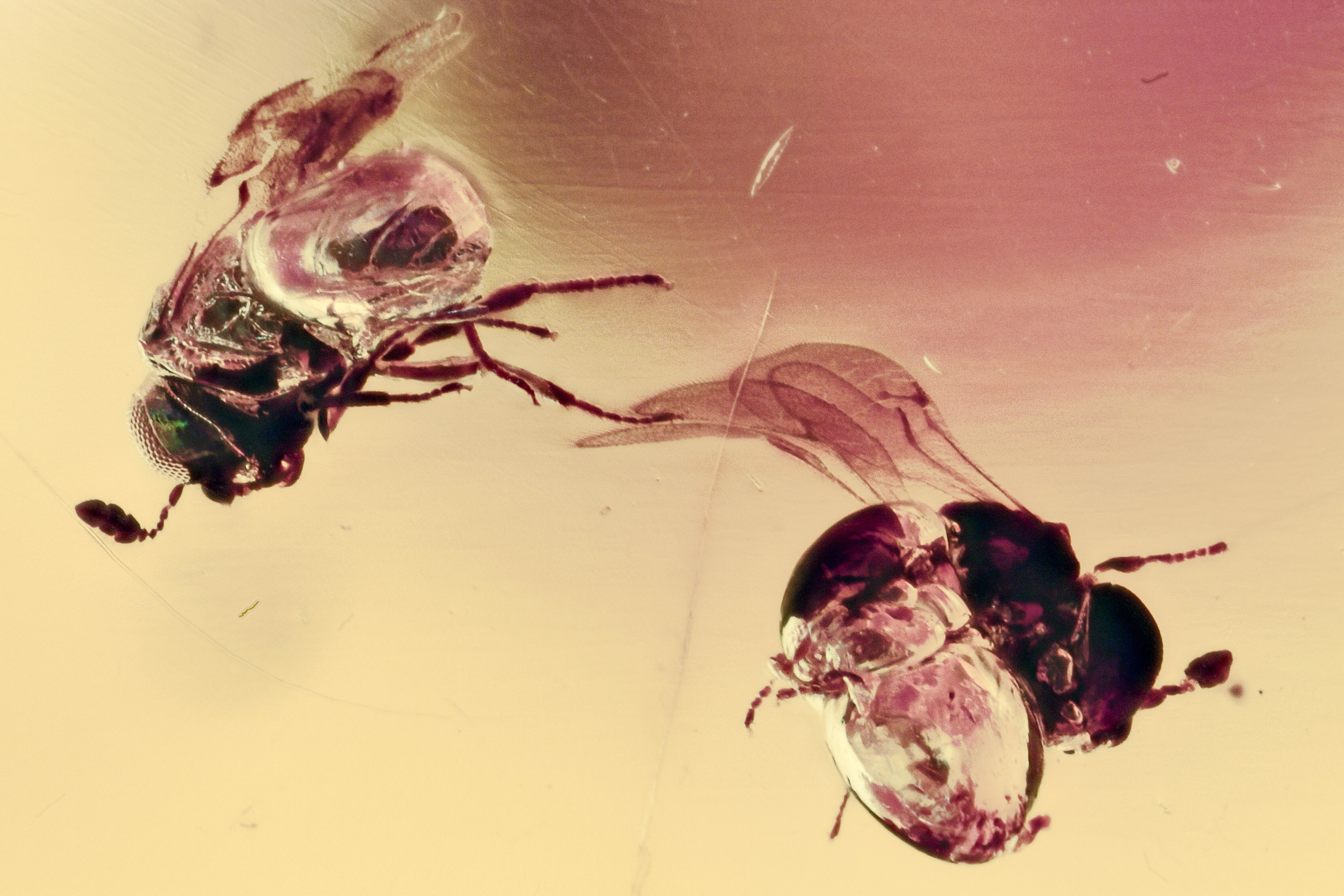 This specimen features two detailed, 44 million year fossil parasitoid wasps (family Scelionidae) preserved in Baltic amber.
