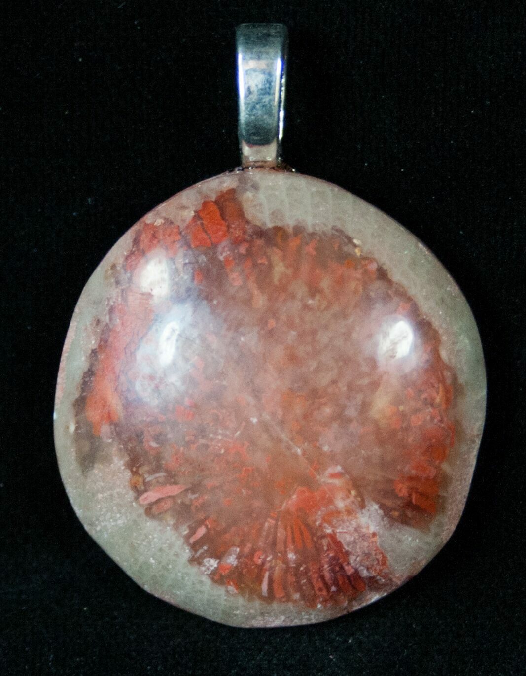 This is a stunning pendant, hand crafted in Utah from 300 million year old, red, agatized horn coral. The coral has been sliced and polished so that it's beautiful internal cell structure is displayed. This fossil horn coral is not actively being mined anymore so there isn't much of it remaining.