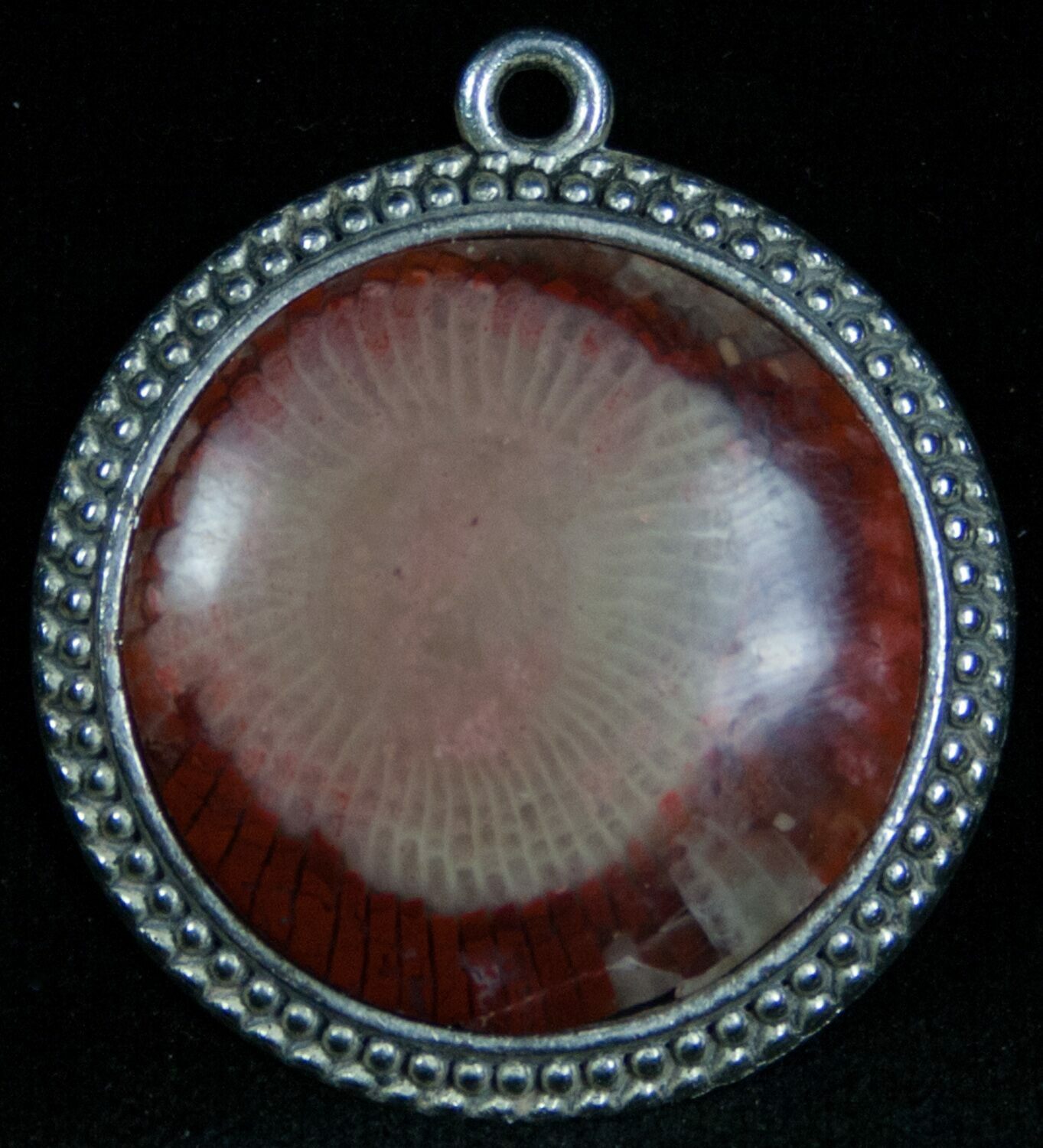 This is a stunning pendant, hand crafted in Utah from 300 million year old, red, agatized horn coral. The coral has been sliced and polished so that it's beautiful internal cell structure is displayed. This fossil horn coral is not actively being mined anymore so there isn't much of it remaining.