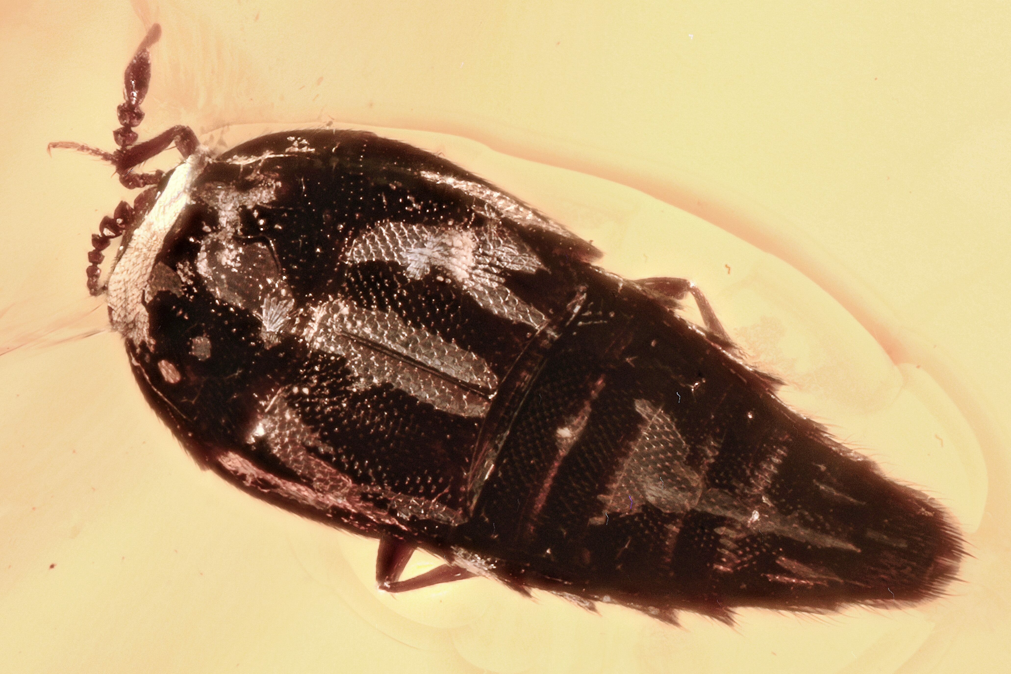 This is a small but detailed, 44 million year old fossil predatory rove beetle (order Coleoptera - genus Oligota) preserved alongside a fungus gnat (family Mycetophilidae) in Baltic amber. This fungus gnat is about 6.9mm long including appendages and wings.