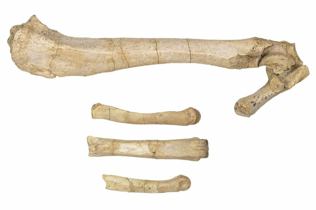 Each of the long bones (metatarsals and tibia) have some repairs along their diaphyses, though very little gap fill restoration was required to piece them back together. The tibia measures 8.6" long and the middle metatarsal measures 4.1" long.