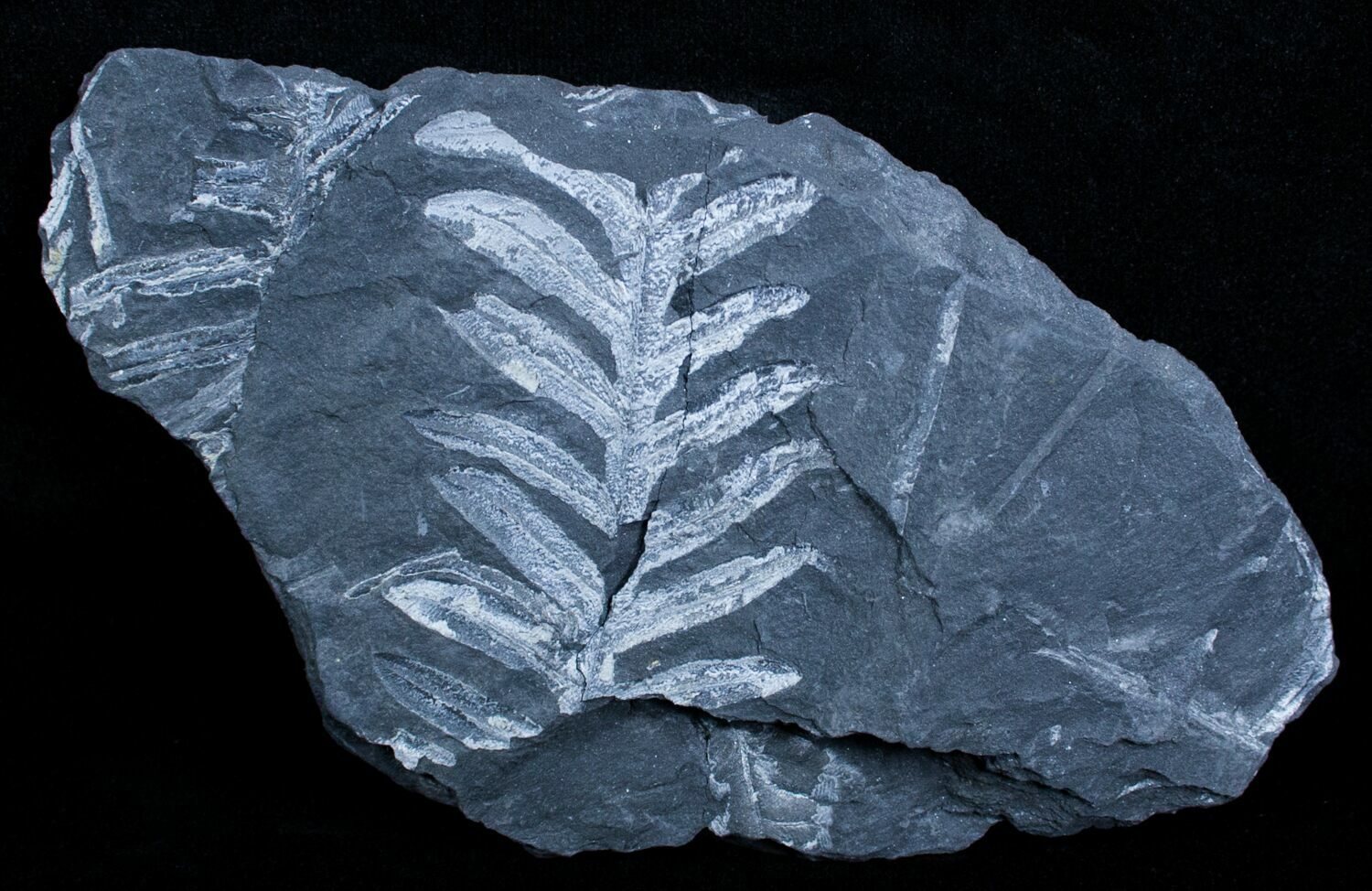 This is a plate of seed fern fossils from the Pennsylvanian aged (305 million year) Llewellyn formation of Pennsylvania. The white color of these detailed fern fossils contrasts well against the black shale they are preserved in. These plants were buried in a swamp where a low temperature, pressure, and oxygen environment the plant tissue was slowly replaced by pyrite. This pyrite was later replaced by a whitish mineral (aluminum silicate) as the fossils were buried and exposed to the heat and pressure inside of the earth. There are several types of seed ferns (which look very similar) on these plates including Alethopteris and Neuropteris.
