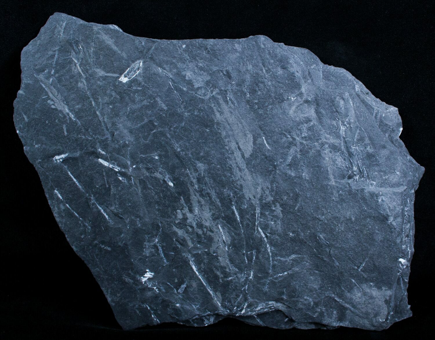 This is a plate of seed fern fossils from the Pennsylvanian aged (305 million year) Llewellyn formation of Pennsylvania. The white color of these detailed fern fossils contrasts well against the black shale they are preserved in. These plants were buried in a swamp where a low temperature, pressure, and oxygen environment the plant tissue was slowly replaced by pyrite. This pyrite was later replaced by a whitish mineral (aluminum silicate) as the fossils were buried and exposed to the heat and pressure inside of the earth. There are several types of seed ferns (which look very similar) on these plates including Alethopteris and Neuropteris.