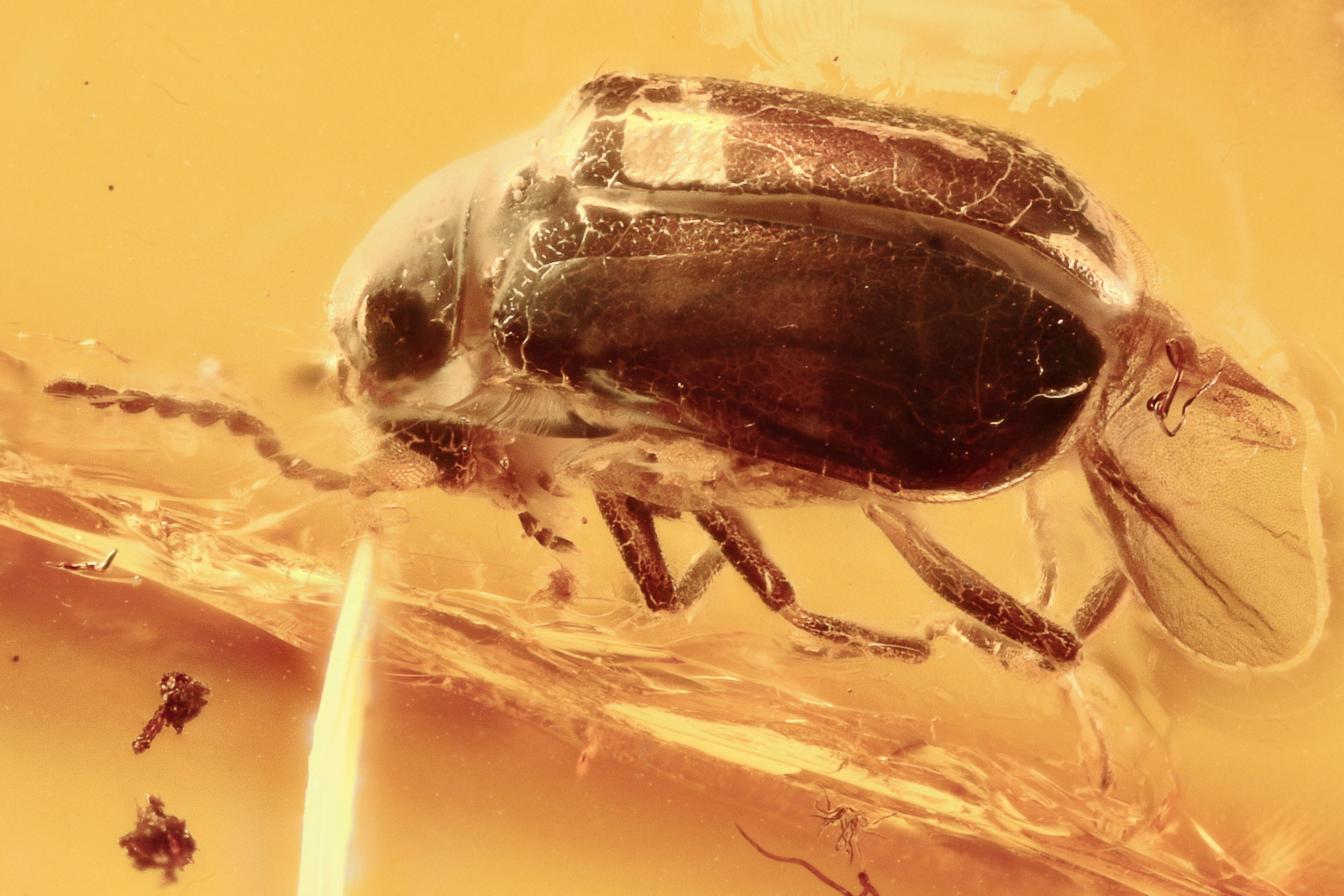 This is a 44 million year old fossil soft-winged flower beetle (order Coleoptera - family Melyridae) with plant debris preserved in Baltic amber. This beetle is about 1.8mm long.