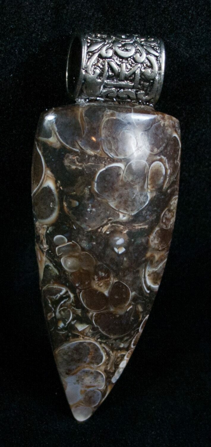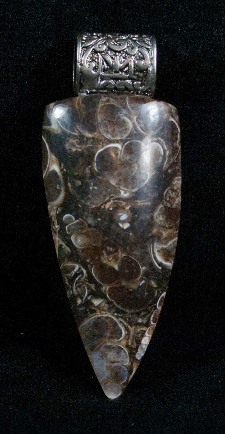This is a beautiful, sterling silver, wire wrapped pendant made from polished rock containing agatized gastropod (snail) fossils. These fossils are Eocene in age or approximately 45-50 million years old. While they are typically referred to as Turritella, these ones are technically of the species Elimia tenera. Elimia is a genus of freshwater snail while Turritella lived in salt water.