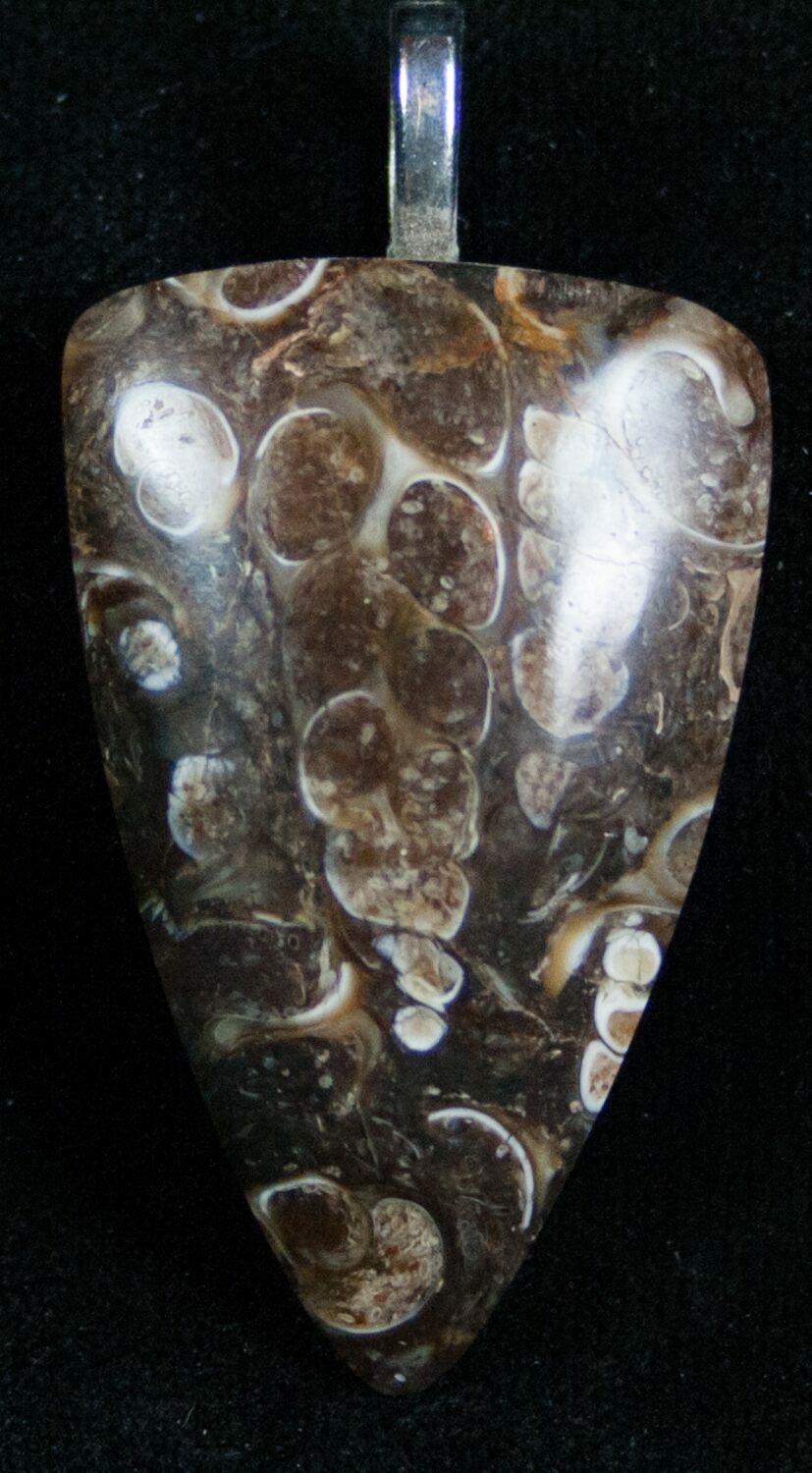 This is a beautiful, sterling silver, wire wrapped pendant made from polished rock containing agatized gastropod (snail) fossils. These fossils are Eocene in age or approximately 45-50 million years old. While they are typically referred to as Turritella, these ones are technically of the species Elimia tenera. Elimia is a genus of freshwater snail while Turritella lived in salt water.