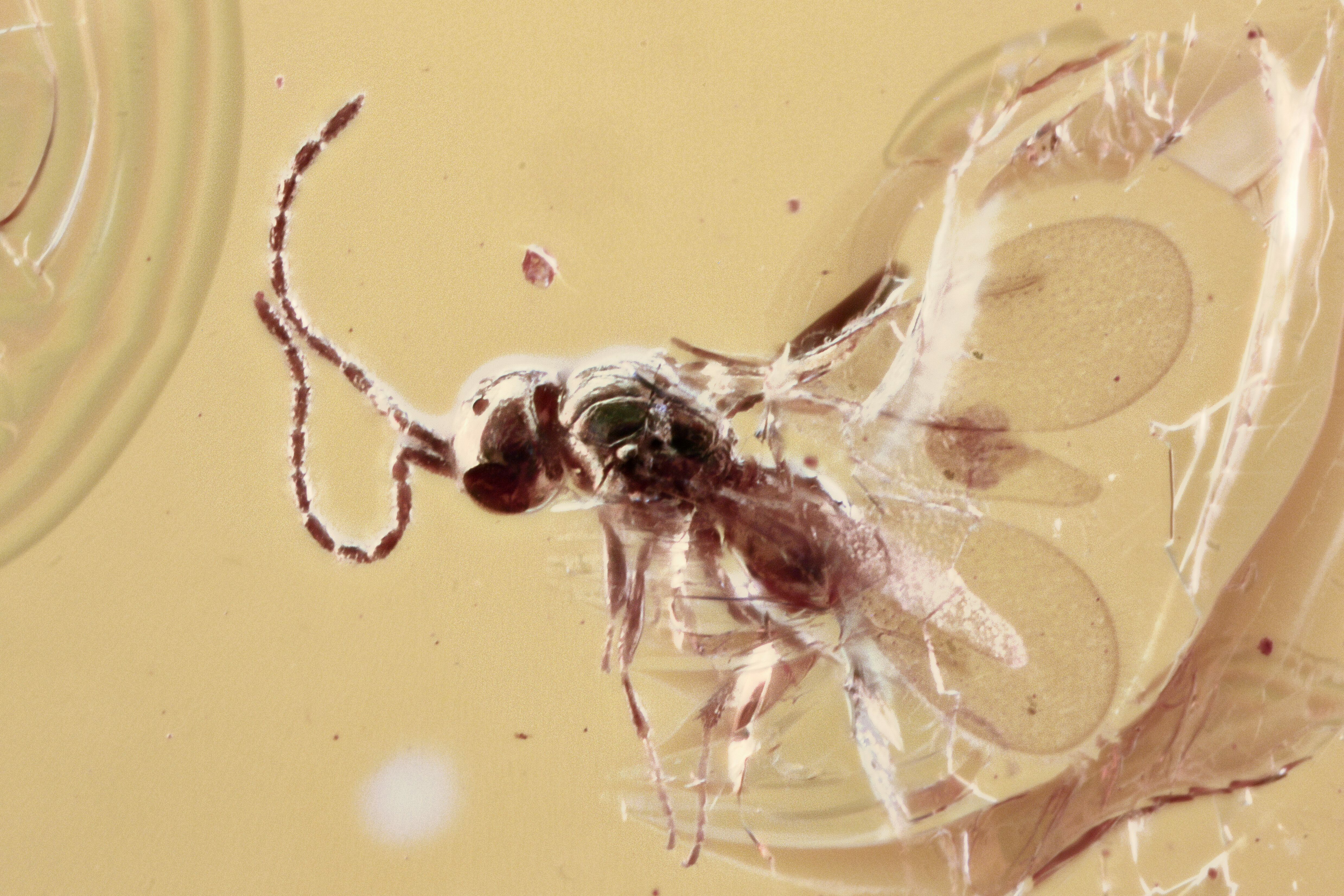 This is a detailed, 44 million year old fossil wasp (order Hymenoptera - family Ceraphronidae) and a gall midge (order Diptera - family Cecidomyiidae) preserved in Baltic amber. The wasp is about 1mm long.