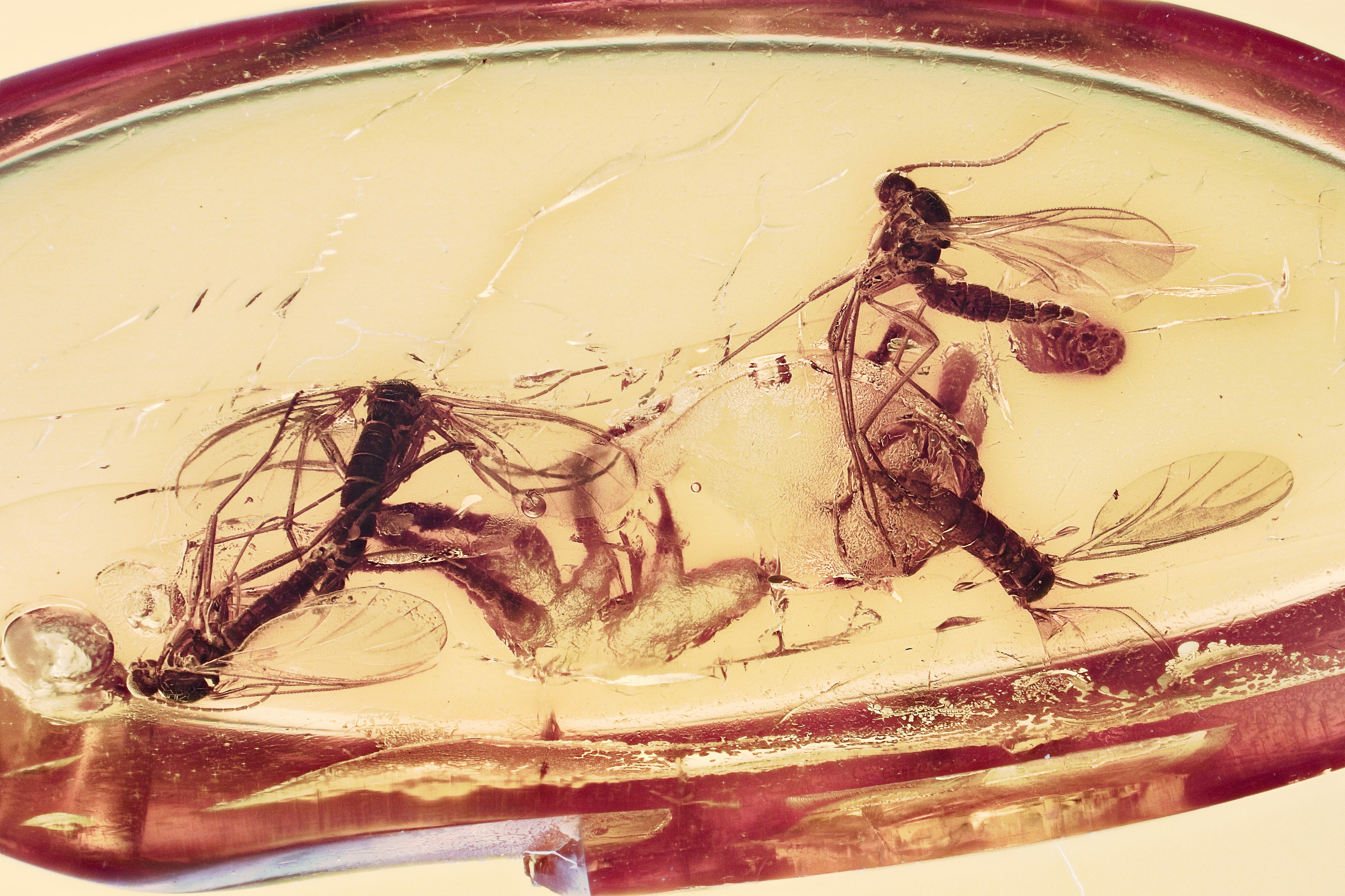These are nicely detailed, 44 million year old fossil dark-winged fungus gnats (order Diptera - family Sciaridae) preserved in Baltic amber.