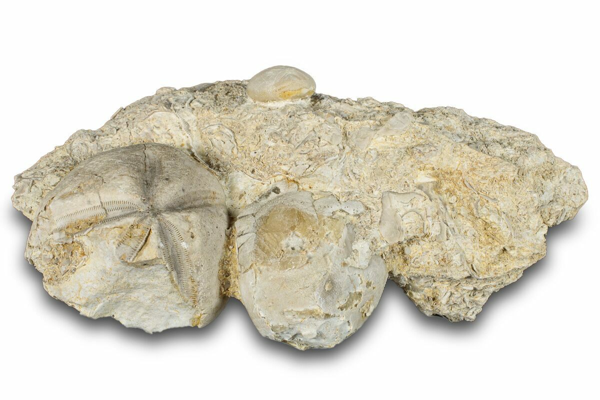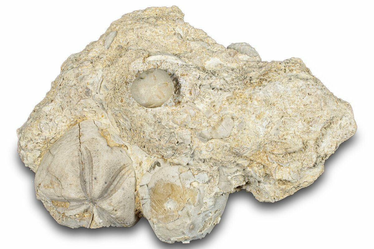 This is a plate containing at least four fossil echinoderms, three likely of the genus Hemiaster and one likely Goniopygus, collected from the Upper Cretaceous deposits near Taouz, Morocco. It comes with an acrylic display stand.