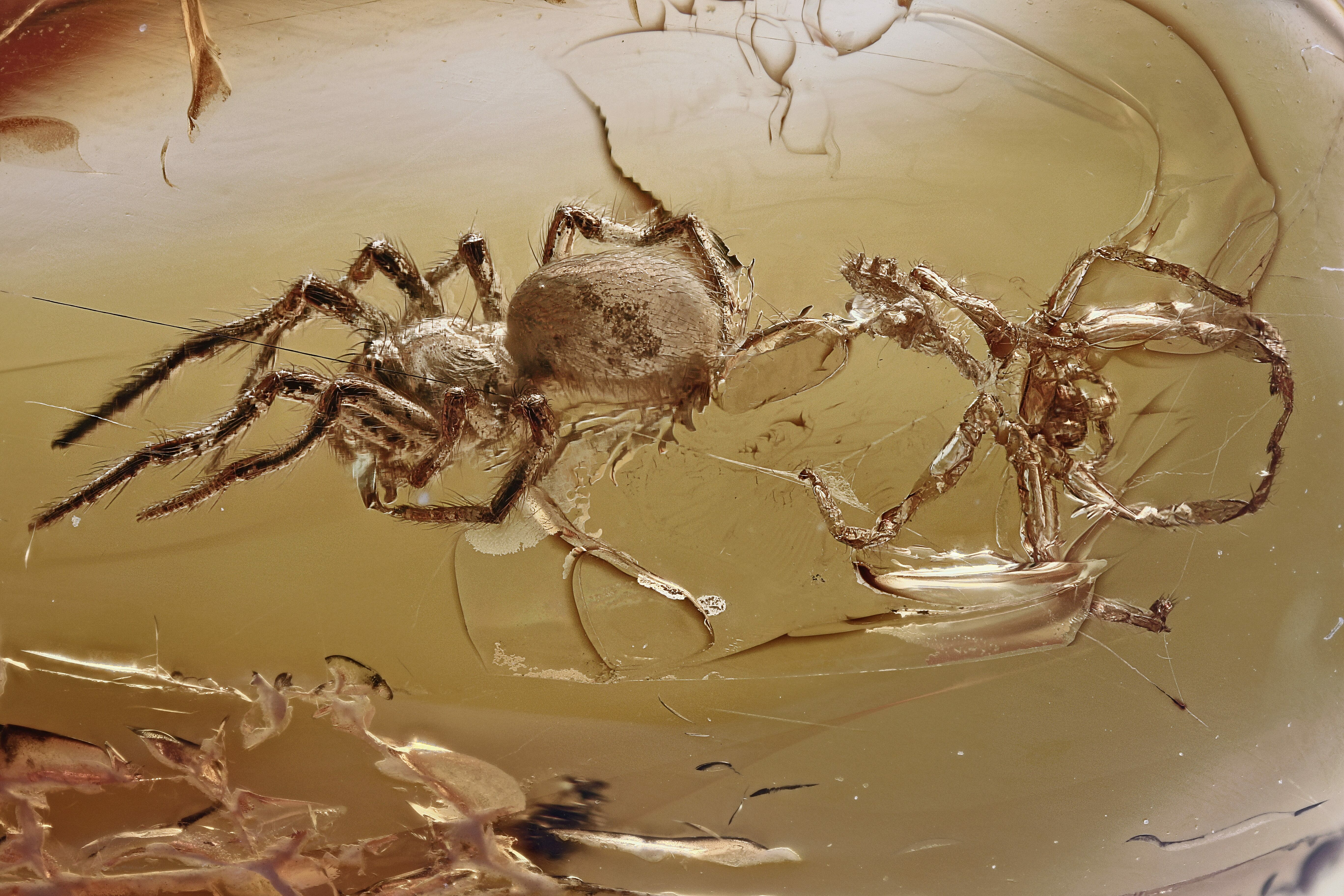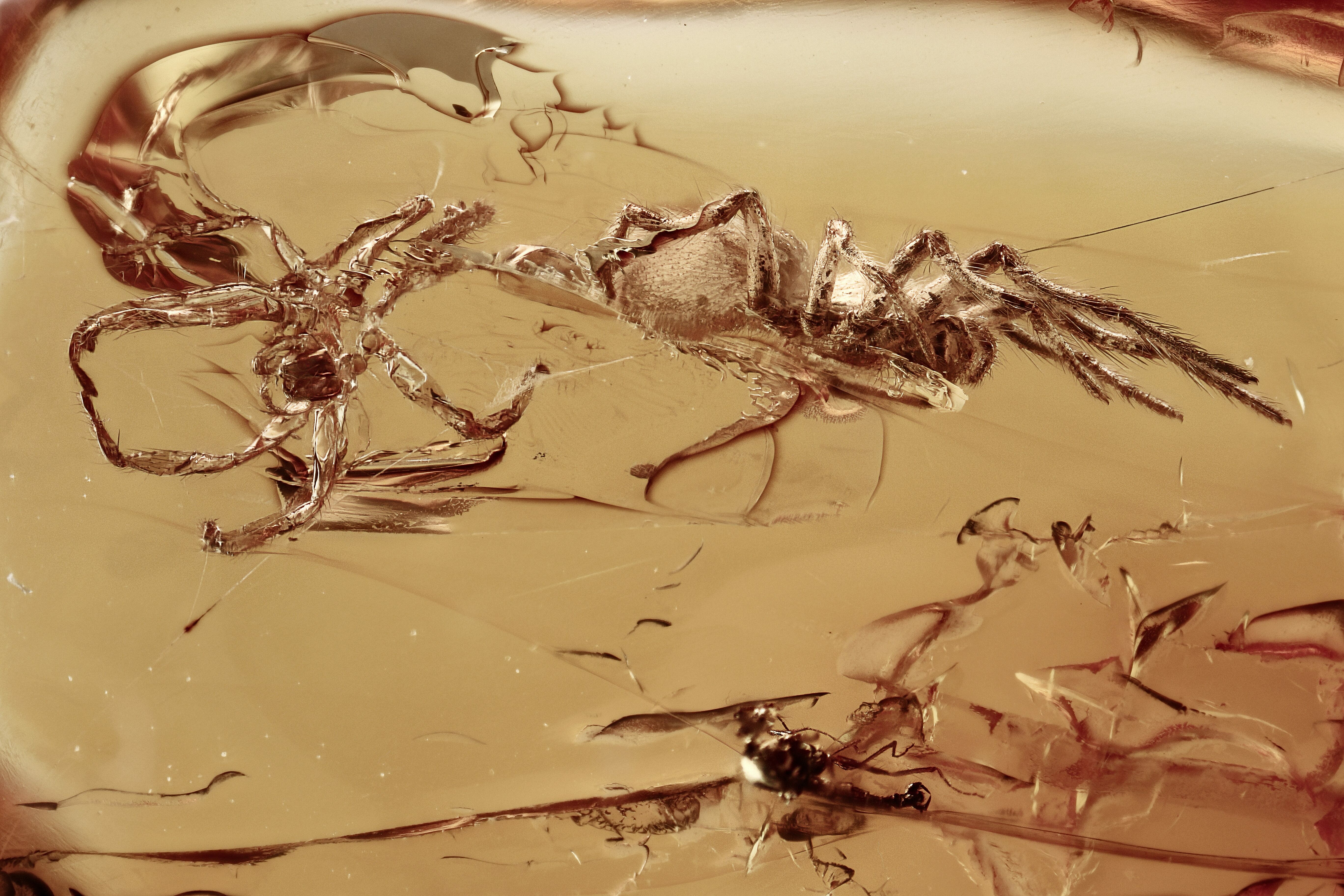 This is an extremely rare and captivating fossil spider (order Araneae) preserved alongside its exuvia and webs in Baltic amber. The spider inclusion measures about 4.5mm long (including appendages) in a 13 x 10 x 4mm piece of amber. Exuviae are the remains of an exoskeleton following the molting of insects, crustaceans, and arachnids, in this case, the spider just molted.