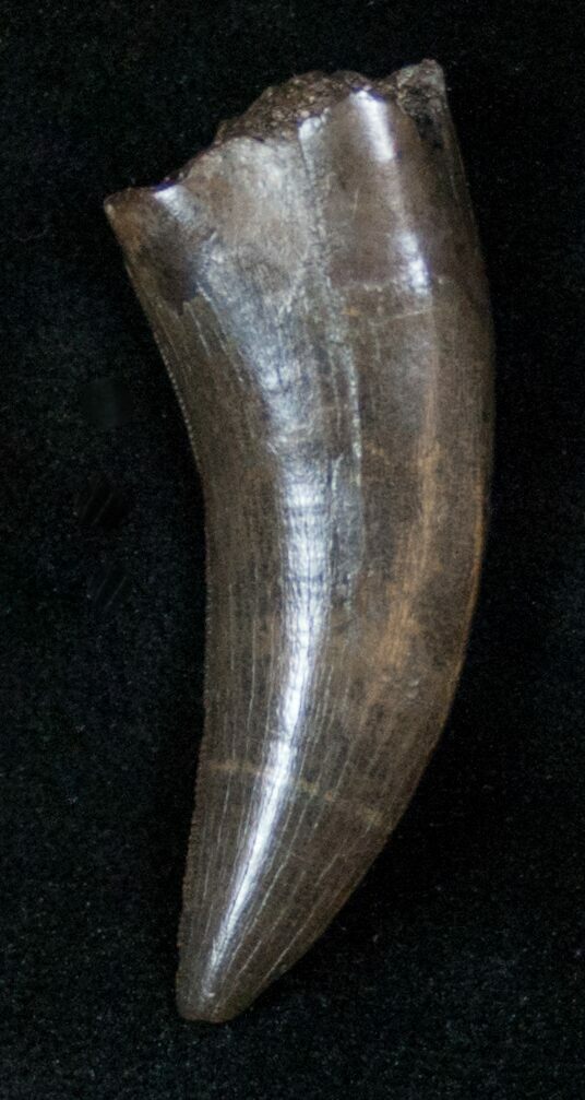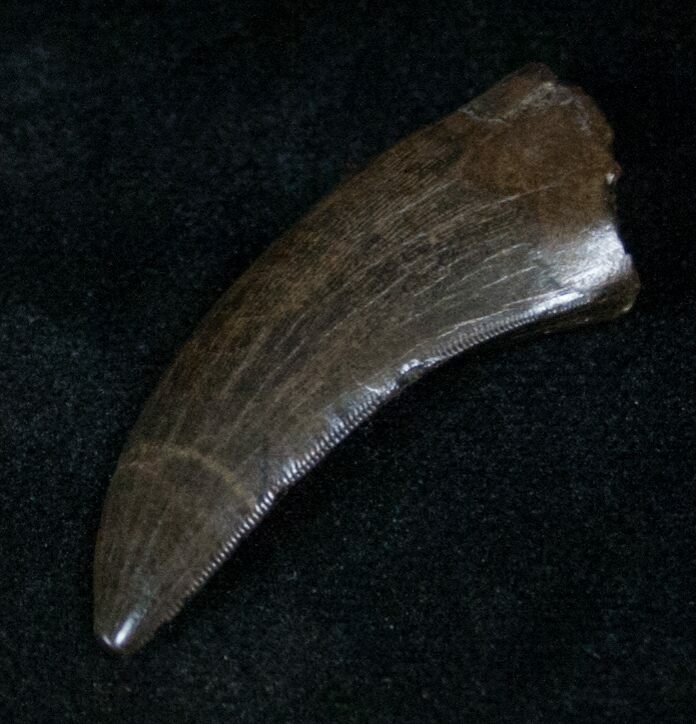 This is a beautiful 1.50" long Tyrannosaurid tooth of the genus Nanotyrannus lancensis tooth from the Hell Creek Formation of Montana. The enamel is nearly flawless on this tooth and it has no restoration or repairs. Most of the anterior serrations are warn but the posterior carina serrations are well preserved.