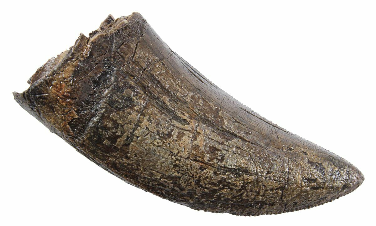This is a beautiful, 2.51" long tooth from Tyrannosaurus rex, collected from the Lance (Creek) Formation of Wyoming. It's rather robust with serration preservation along both edges. True T. rex teeth are some of the most sought-after and collectible fossils out there.
