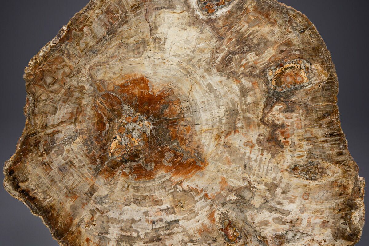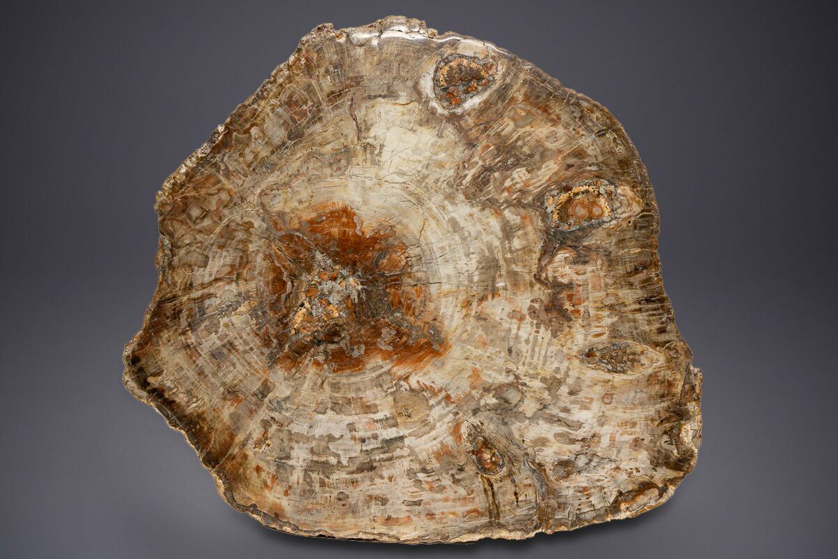 Several distinct circular areas of fossilized fungal rot are visible within the wood, adding rare character and making this piece truly one-of-a-kind.