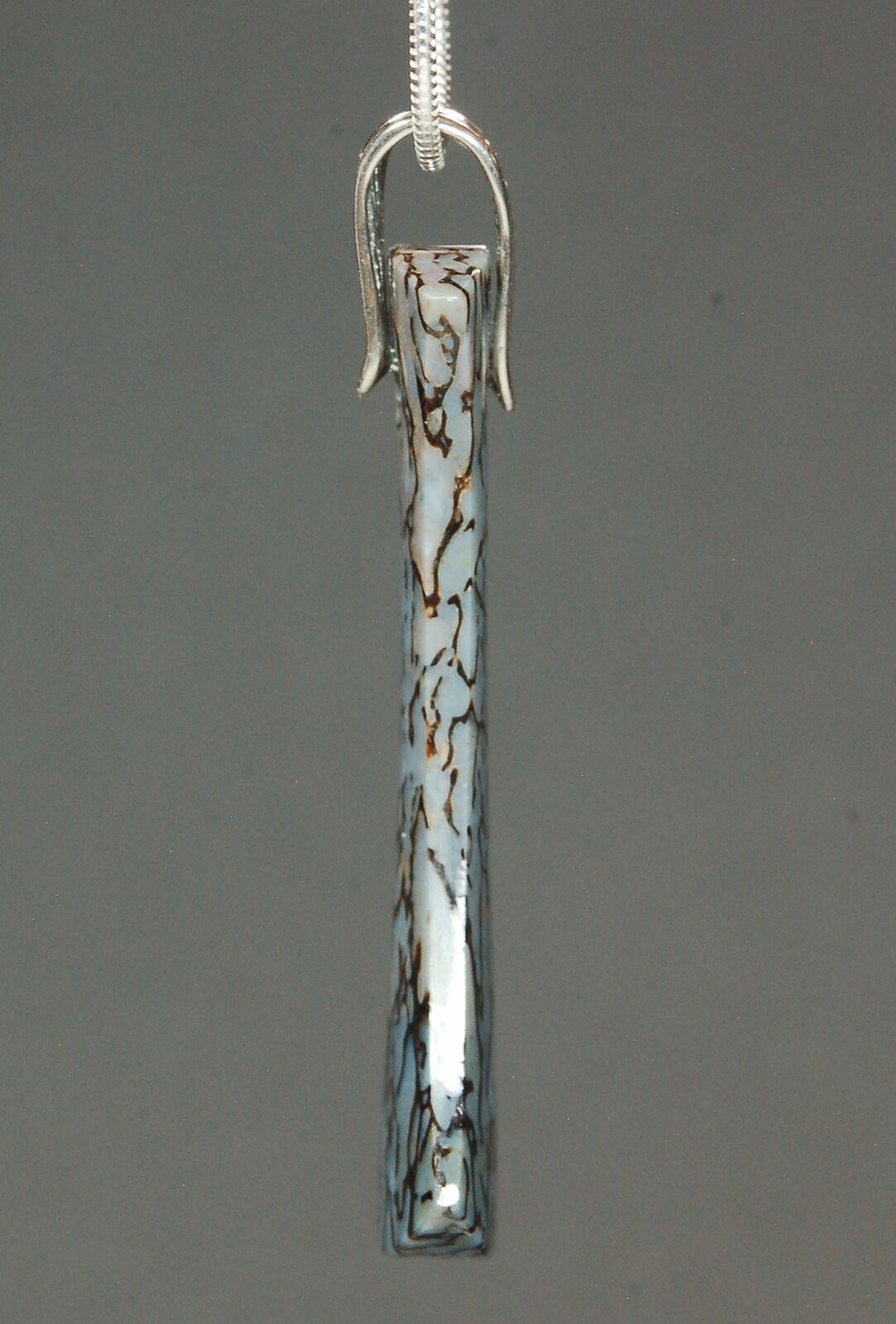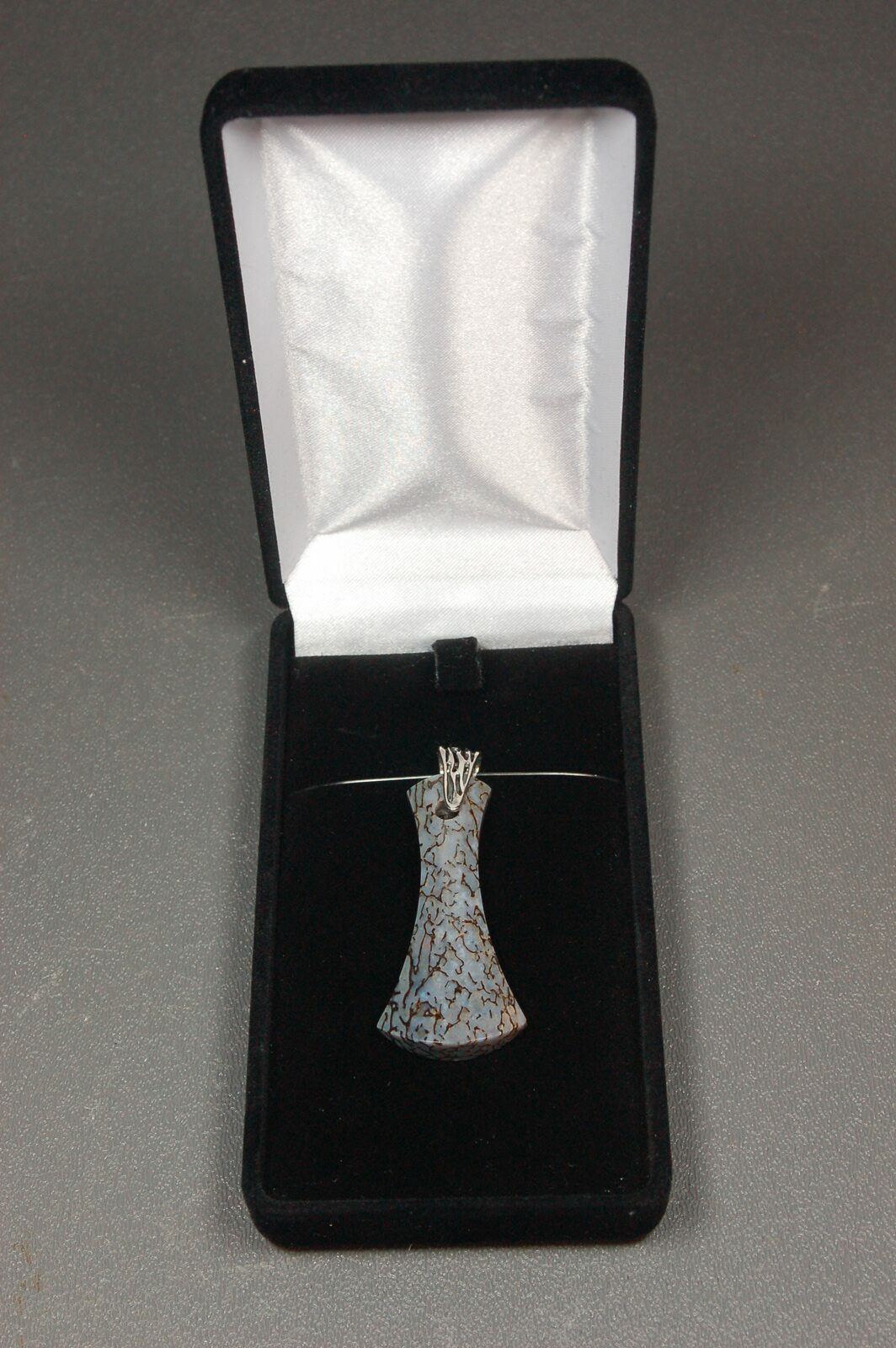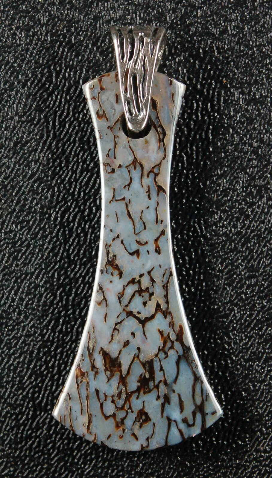 This is a stunning, blue, axe shaped pendant hand crafted from 150 million year old, agatized dinosaur bone (gembone) by master stone craftsman, Kenneth Kolb.