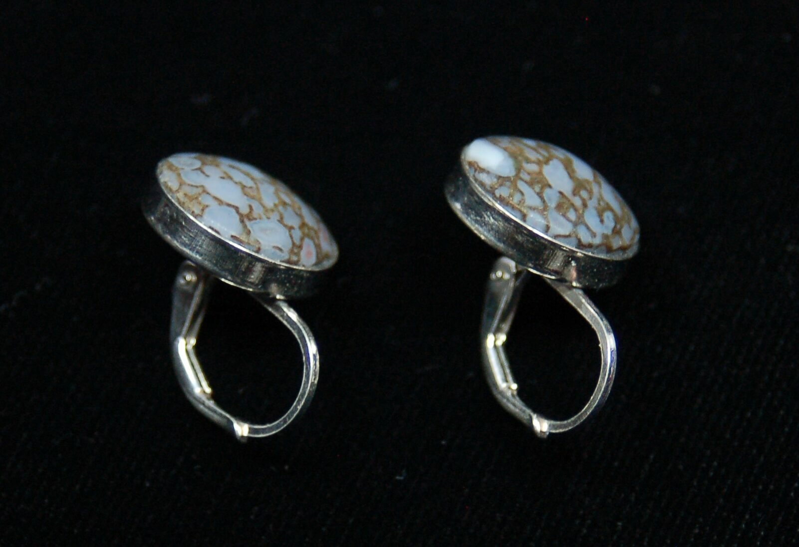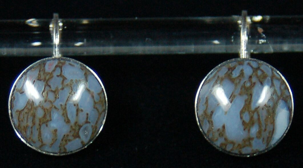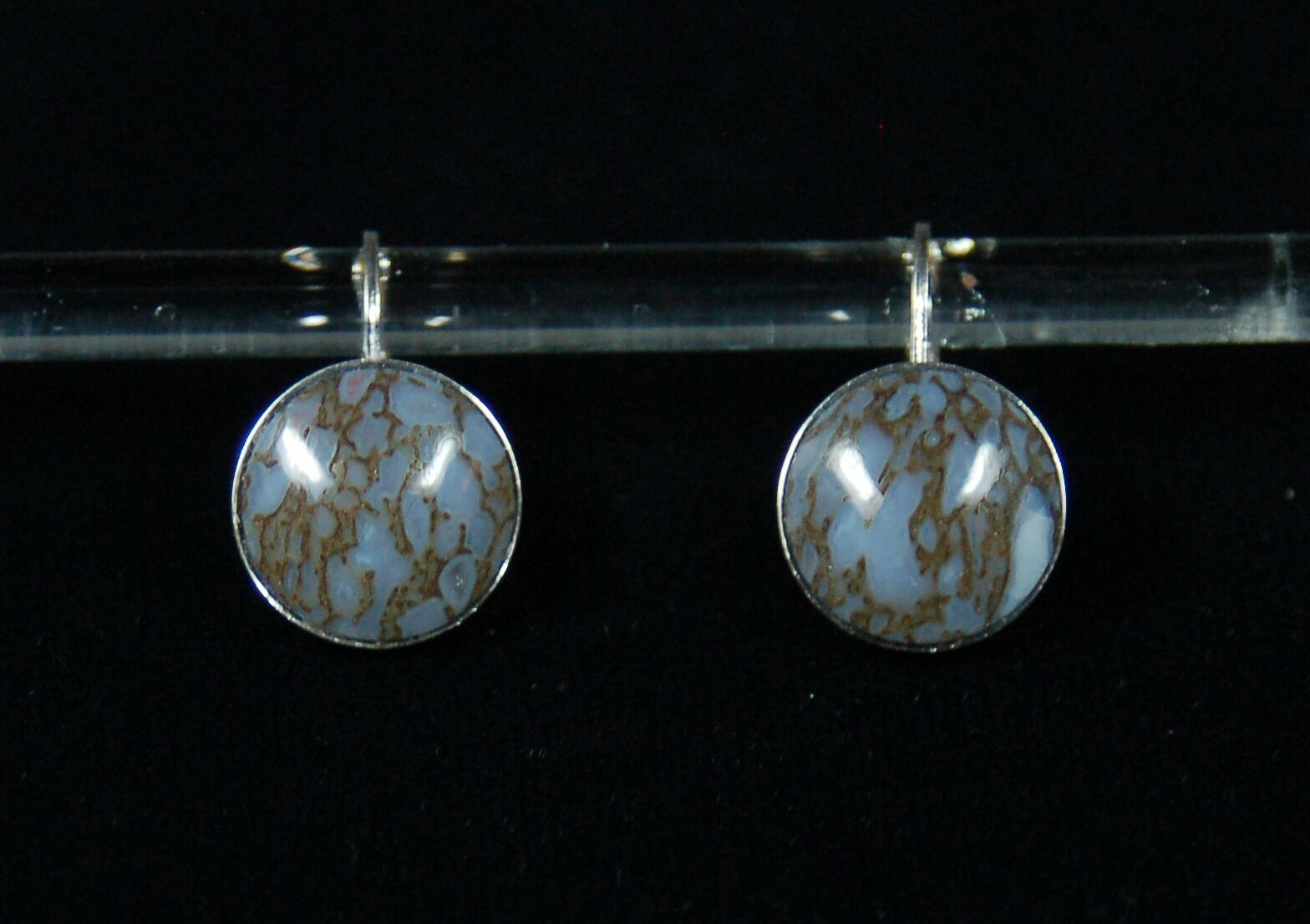 This is a pair of beautiful, dark blue, earrings hand crafted from 150 million year old agatized dinosaur bone (gembone) by master stone craftsman, Kenneth Kolb. The amazingly agatized cell structure of the bone creates fantastic patterns when polished.