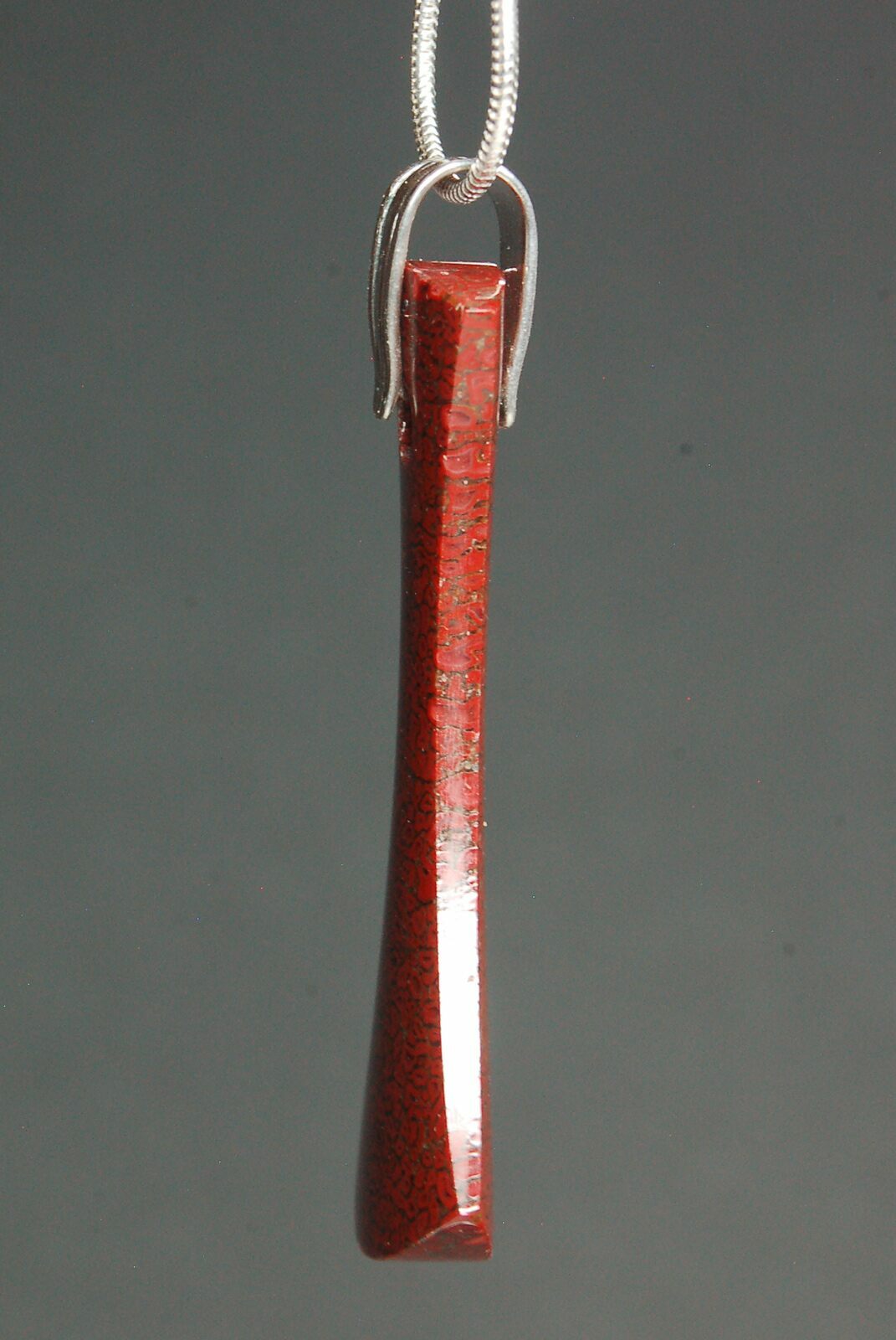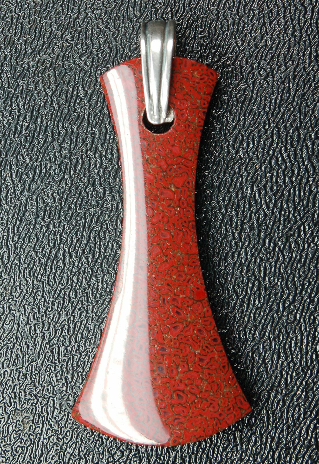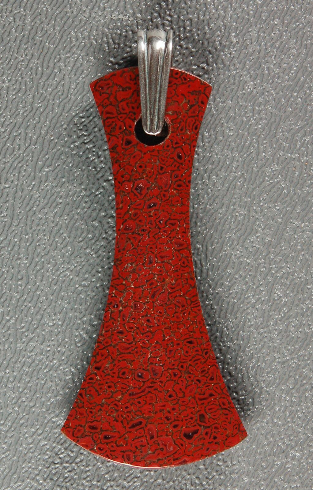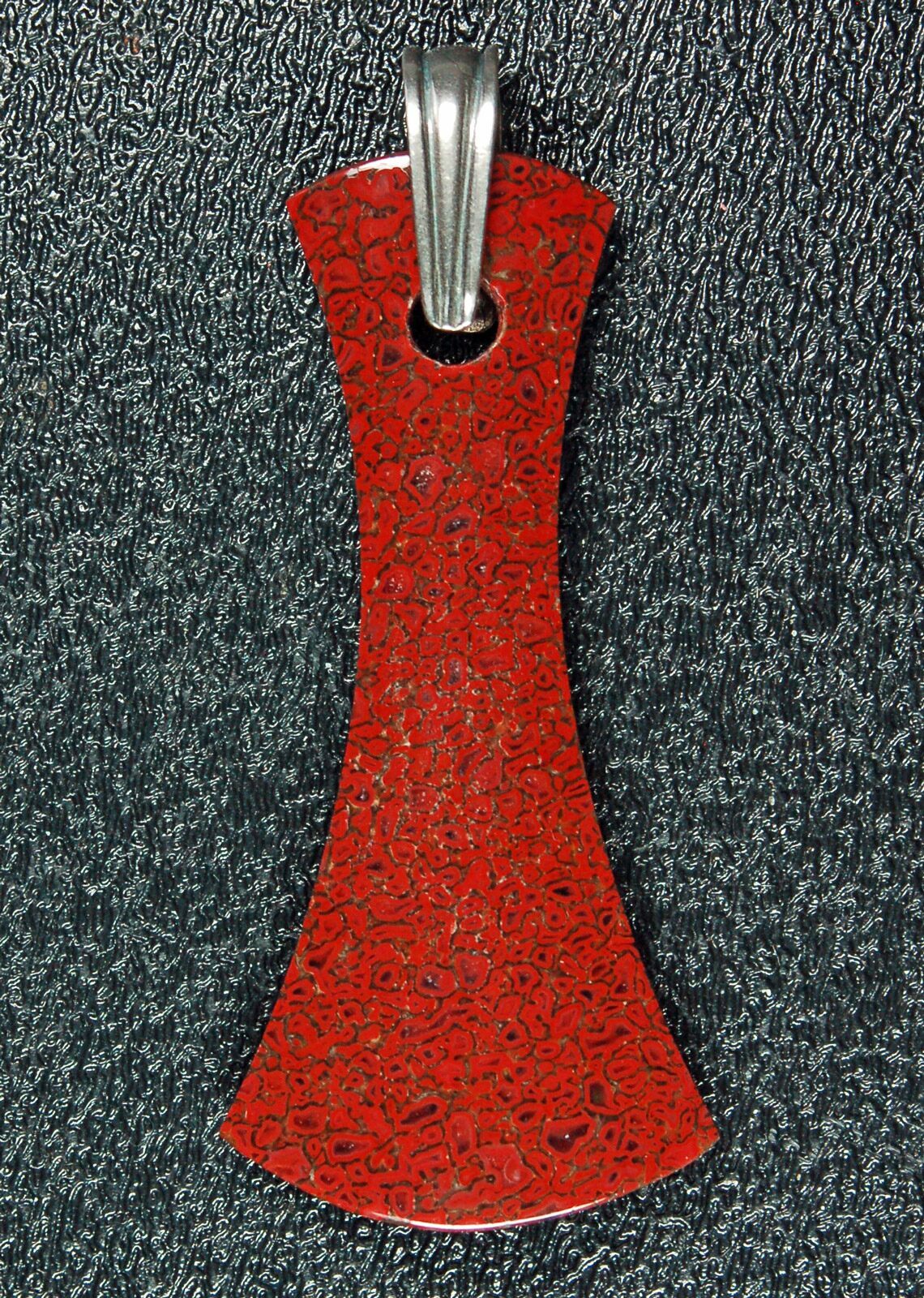 This is a stunning, red, axe shaped pendant hand crafted from 150 million year old, agatized dinosaur bone (gembone) by master stone craftsman, Kenneth Kolb.