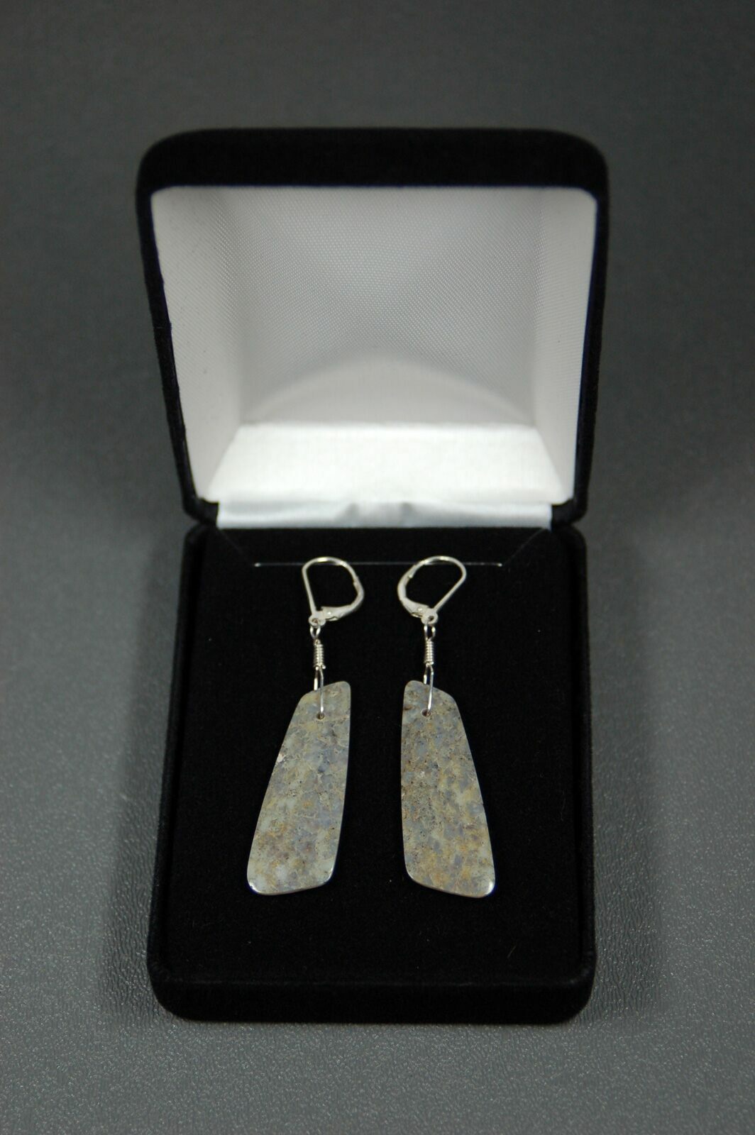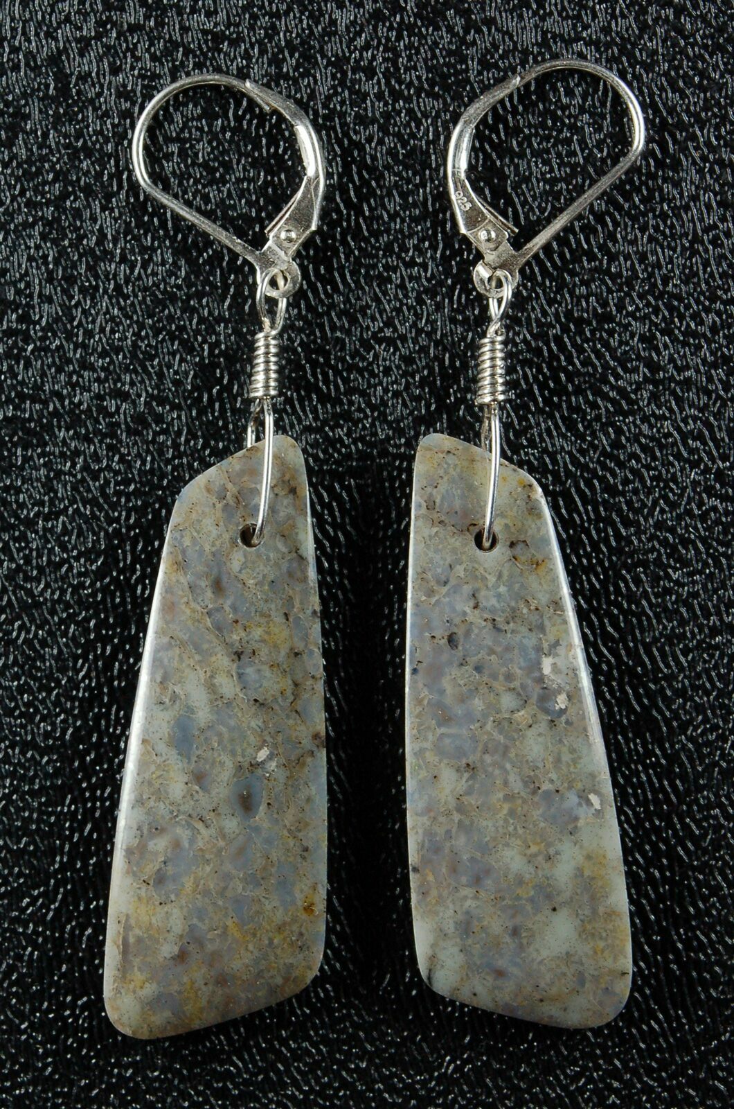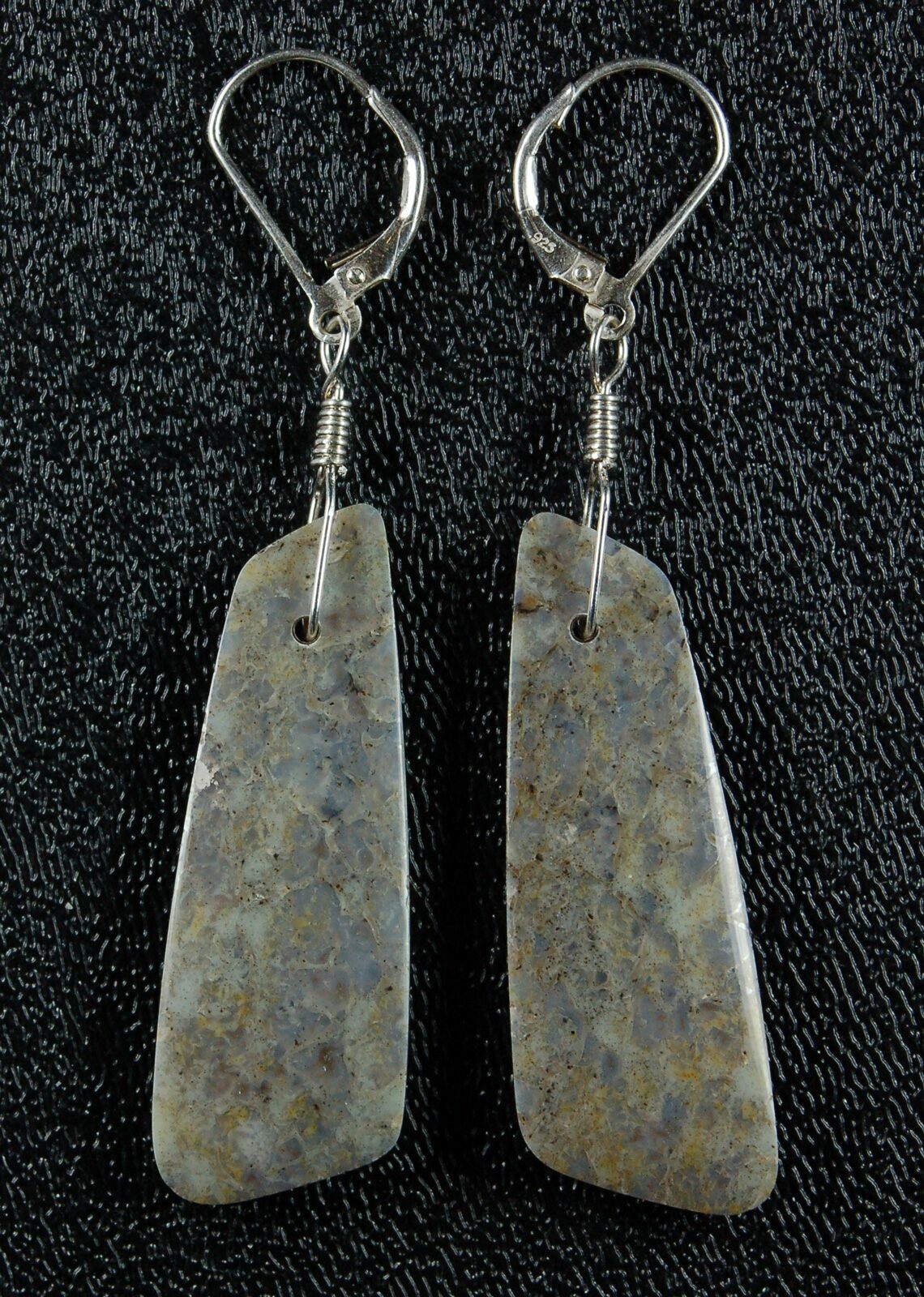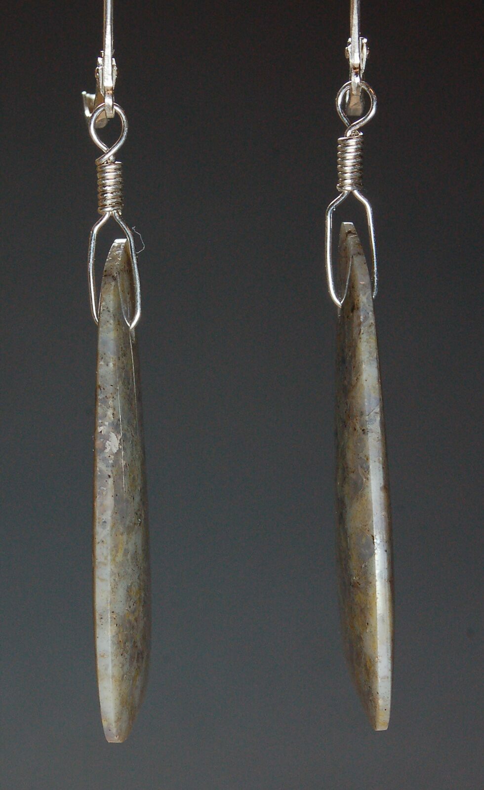This is a pair of gorgeous trapezoidal earrings hand crafted from 150 million year old, agatized dinosaur bone (gembone) by master stone craftsman, Kenneth Kolb. The amazingly agatized cell structure of the bone creates green/brown spiderweb appearance. These one-of-a-kind earrings are 1 3/4" x 9/16" x 1/8"