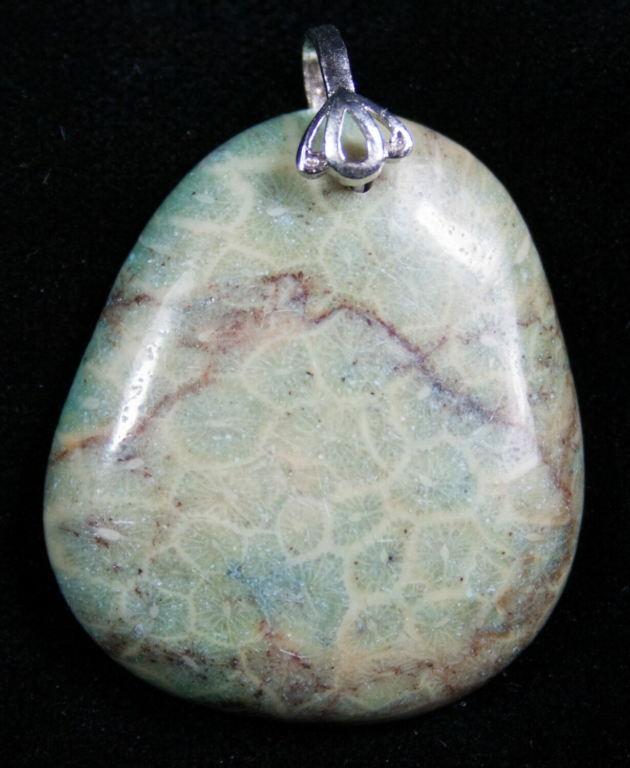 This is a pendant made from agatized, fossil coral from Sumatra, Indonesia. The polishing allows the beautiful, fossilized structure of the coral heads to easily be seen.