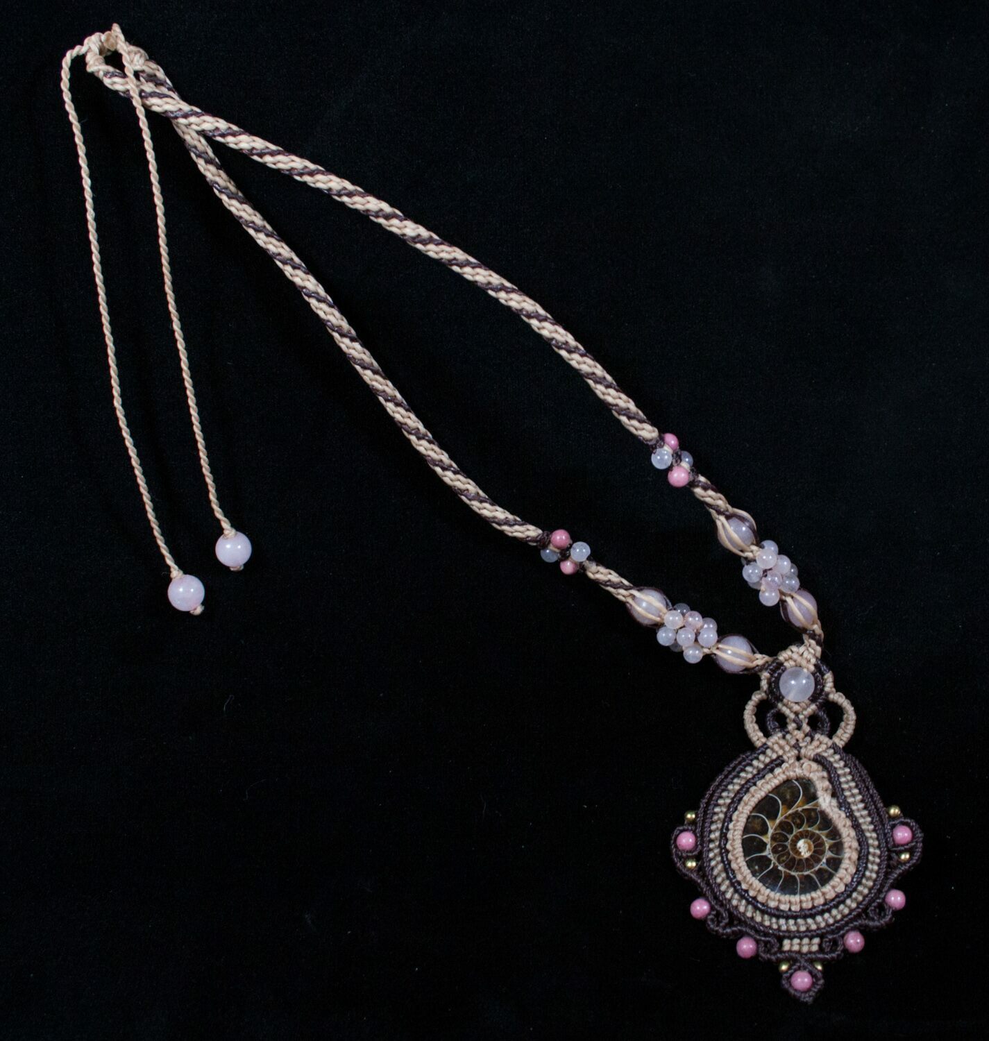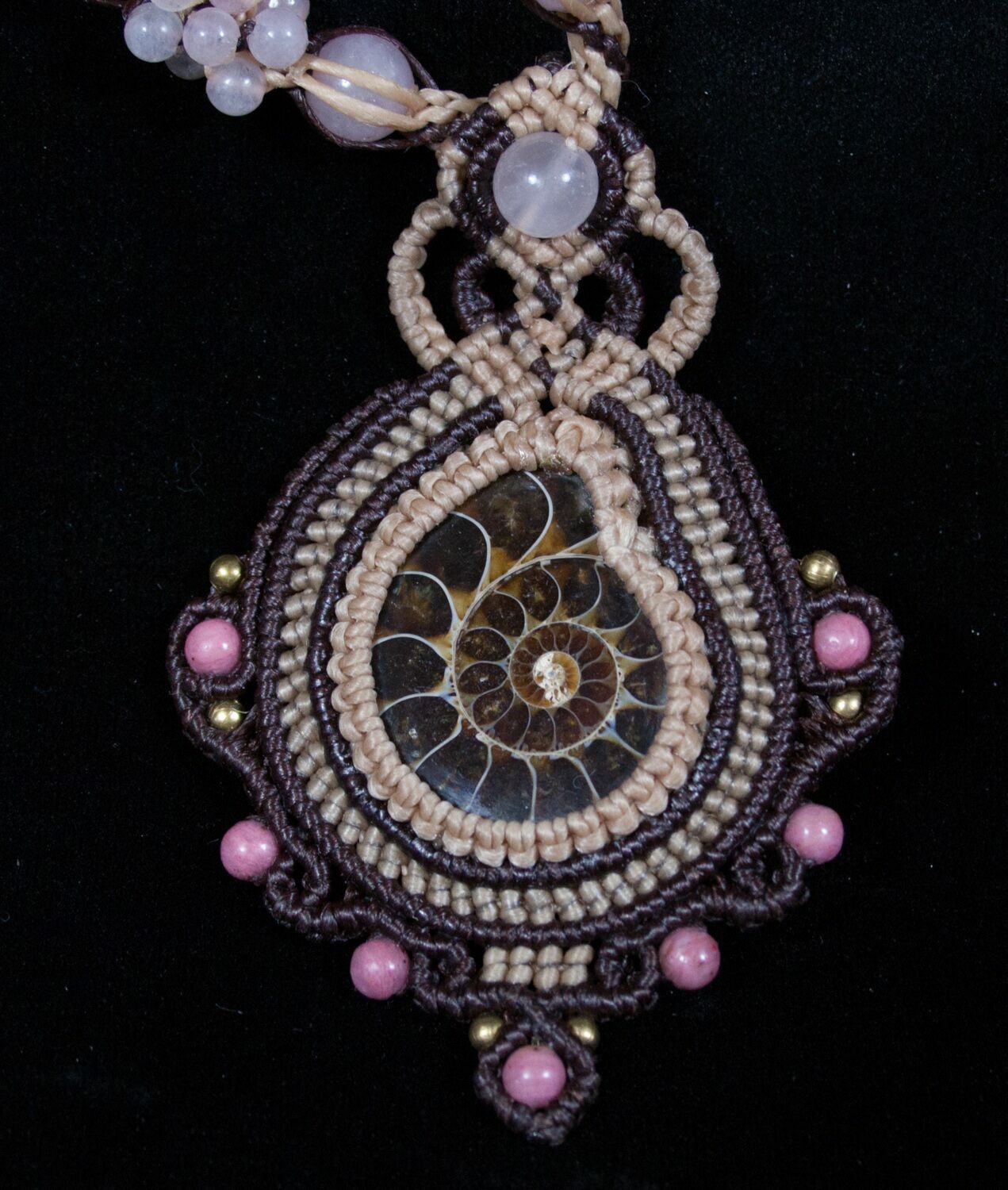This is a handcrafted Macrame necklace featuring a real ammonite fossil from Madagascar as the centerpiece. The ammonite itself is about 1 1/4 inches in diameter and the length of the cord is 19 inches. Macrame is a weaving technique that does not use any kind of machinery or tools, just working with fingers.