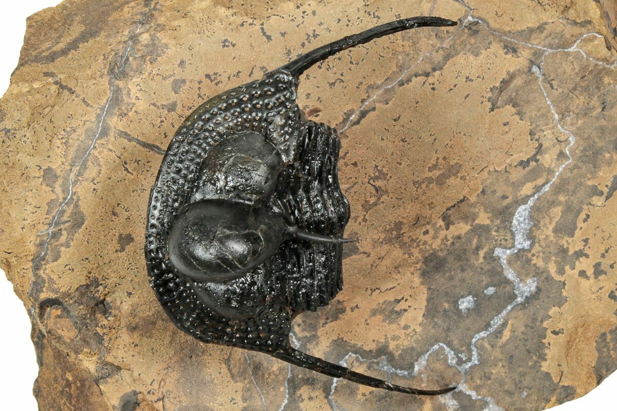 This is a killer, 1.7" long (including spines) Onnia trilobite from the Ordovician of Morocco. It is absolutely gigantic for the species and the preservation is excellent. The spines have been prepared free-standing and it has no restoration.
