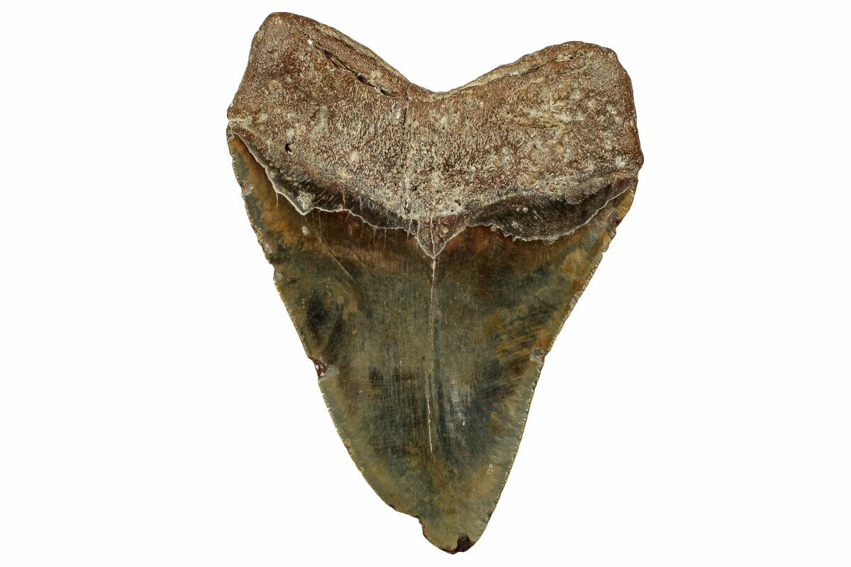 The standard measure for megalodon teeth is slant height, or the longest edge of the tooth. Adult megalodon teeth were typically in the 4 to 5 inch range: teeth over 6 inches are rare and represent super-sized individuals. Only a handful of teeth have ever been found over seven inches.