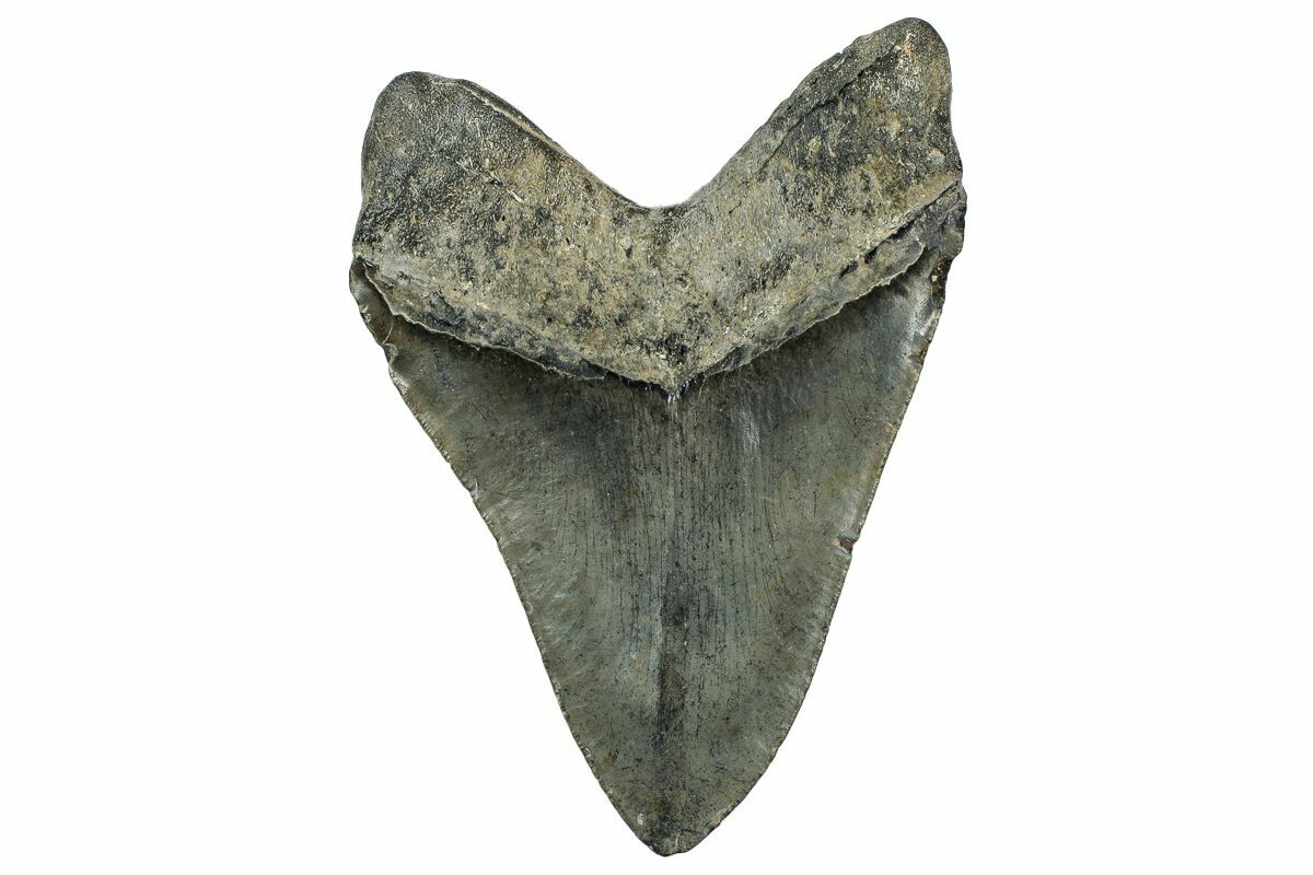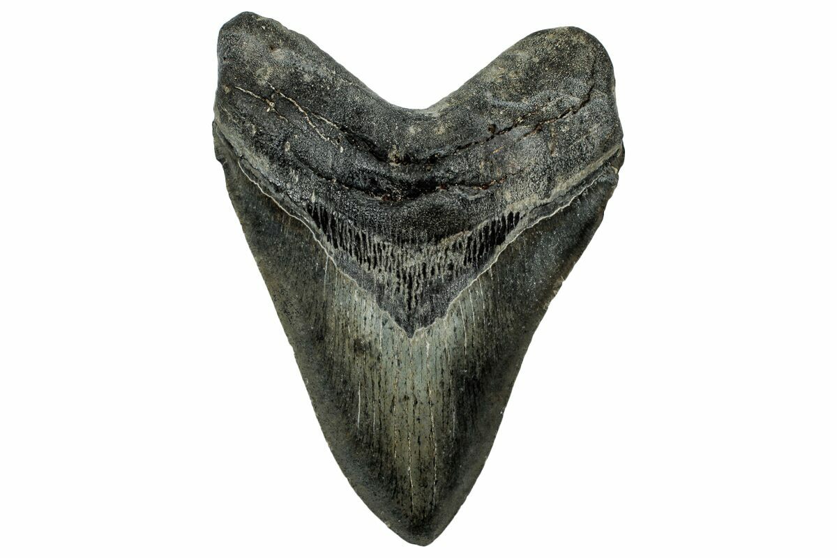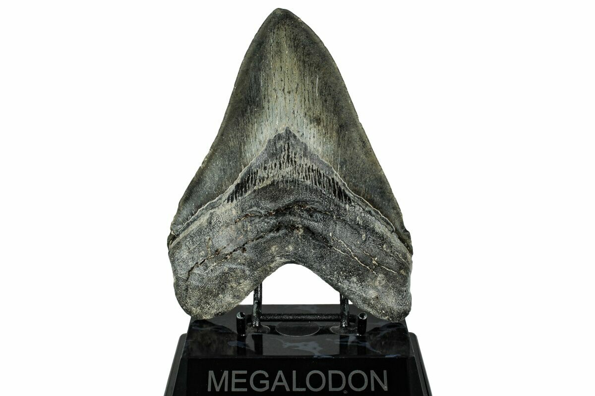 The standard measure for megalodon teeth is slant height, or the longest edge of the tooth. Adult megalodon teeth were typically in the 4 to 5 inch range: teeth over 6 inches are rare and represent super-sized individuals. Only a handful of teeth have ever been found over seven inches.
