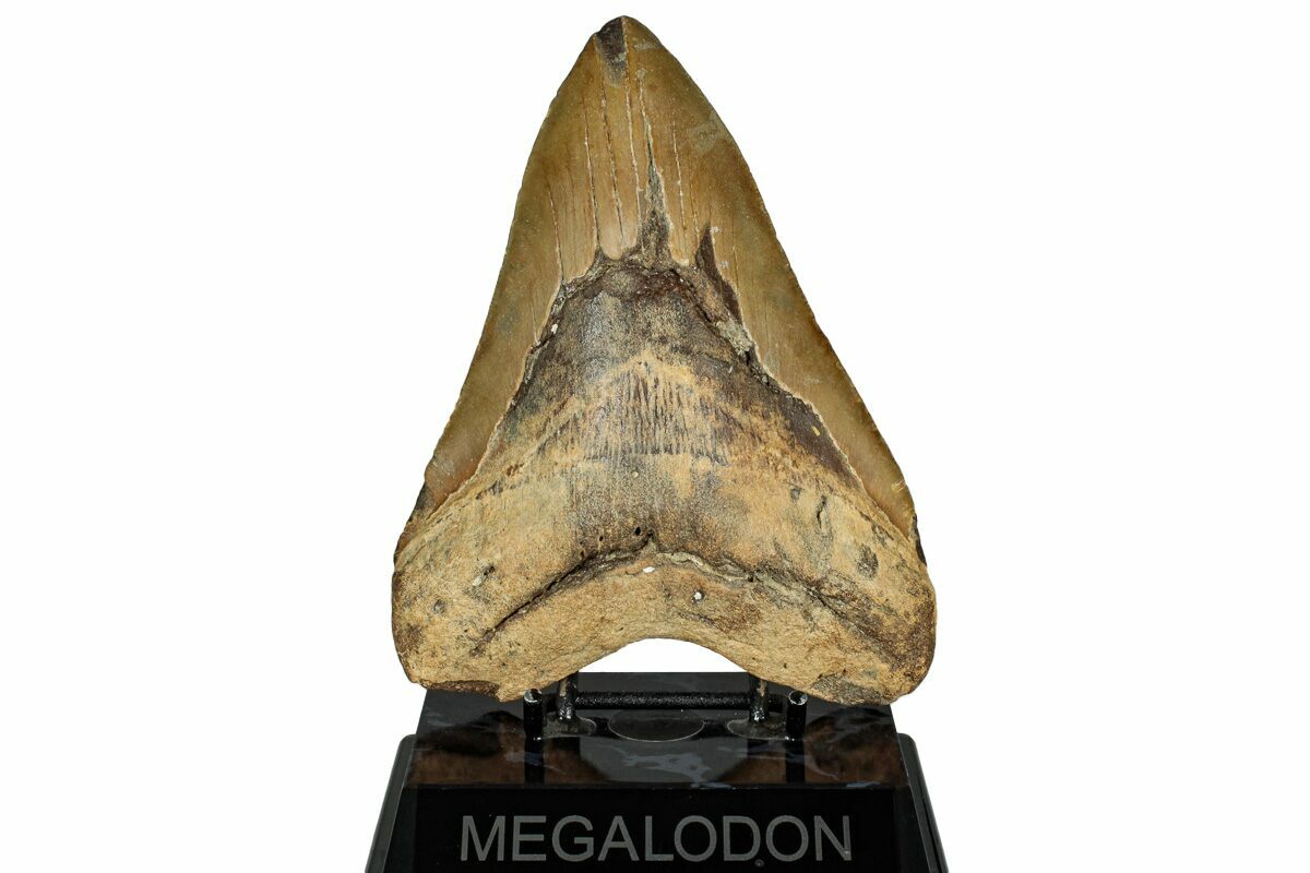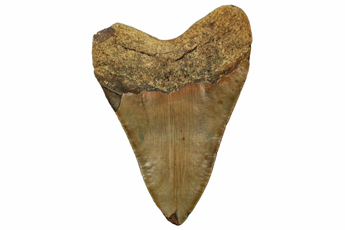 The standard measure for megalodon teeth is slant height, or the longest edge of the tooth. Adult megalodon teeth were typically in the 4 to 5 inch range: teeth over 6 inches are rare and represent super-sized individuals. Only a handful of teeth have ever been found over seven inches.