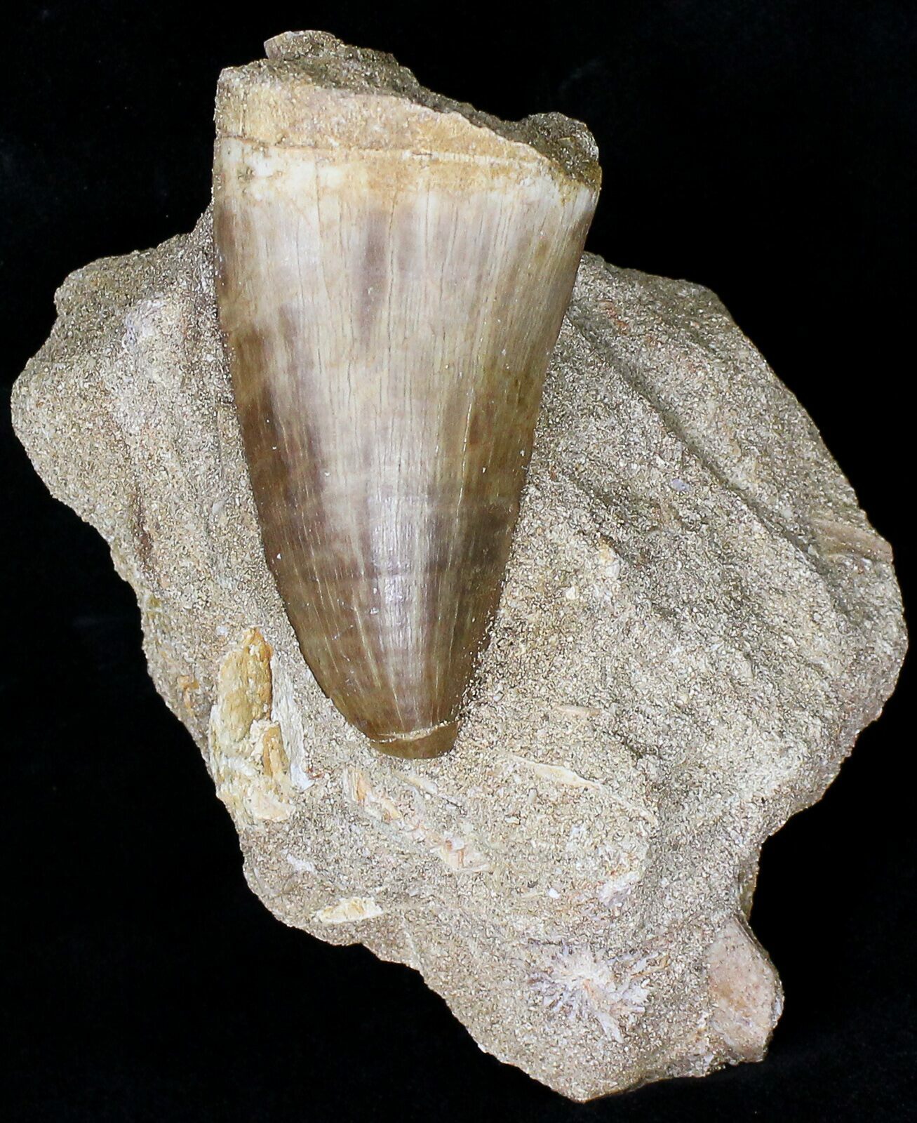 This is a nice tooth of the Mosasaur, Prognathodon from the Upper Cretaceous phosphate deposits in the Oulad Abdoun Basin of Morocco. These teeth are collected as a by product of the massive phosphate mining operations in the area. This tooth is still embedded in the matrix it was found in.