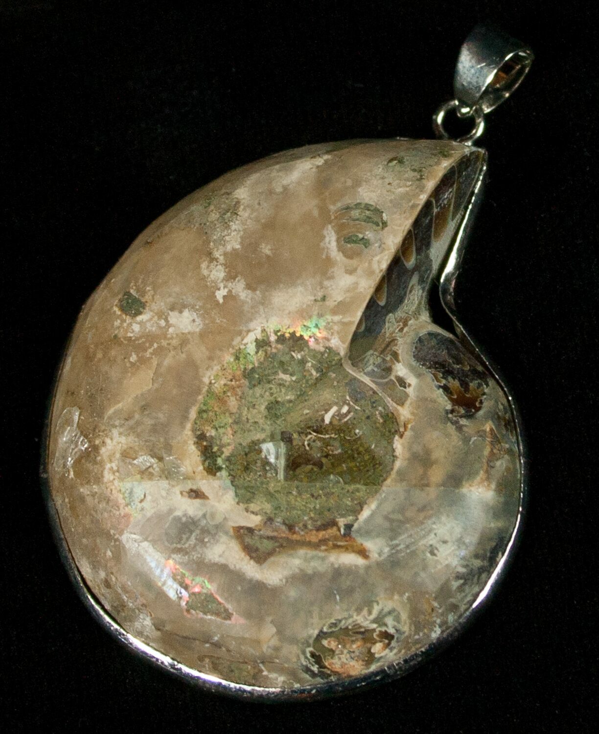 Here is a beautiful pendant featuring a cut and polished, 110 million year old ammonite fossil from Madagascar. The ammonite fossil is 1 3/4 inches tall and the beautiful structure of the inner chambers can easily be seen. Really a beautiful piece of natural history.
