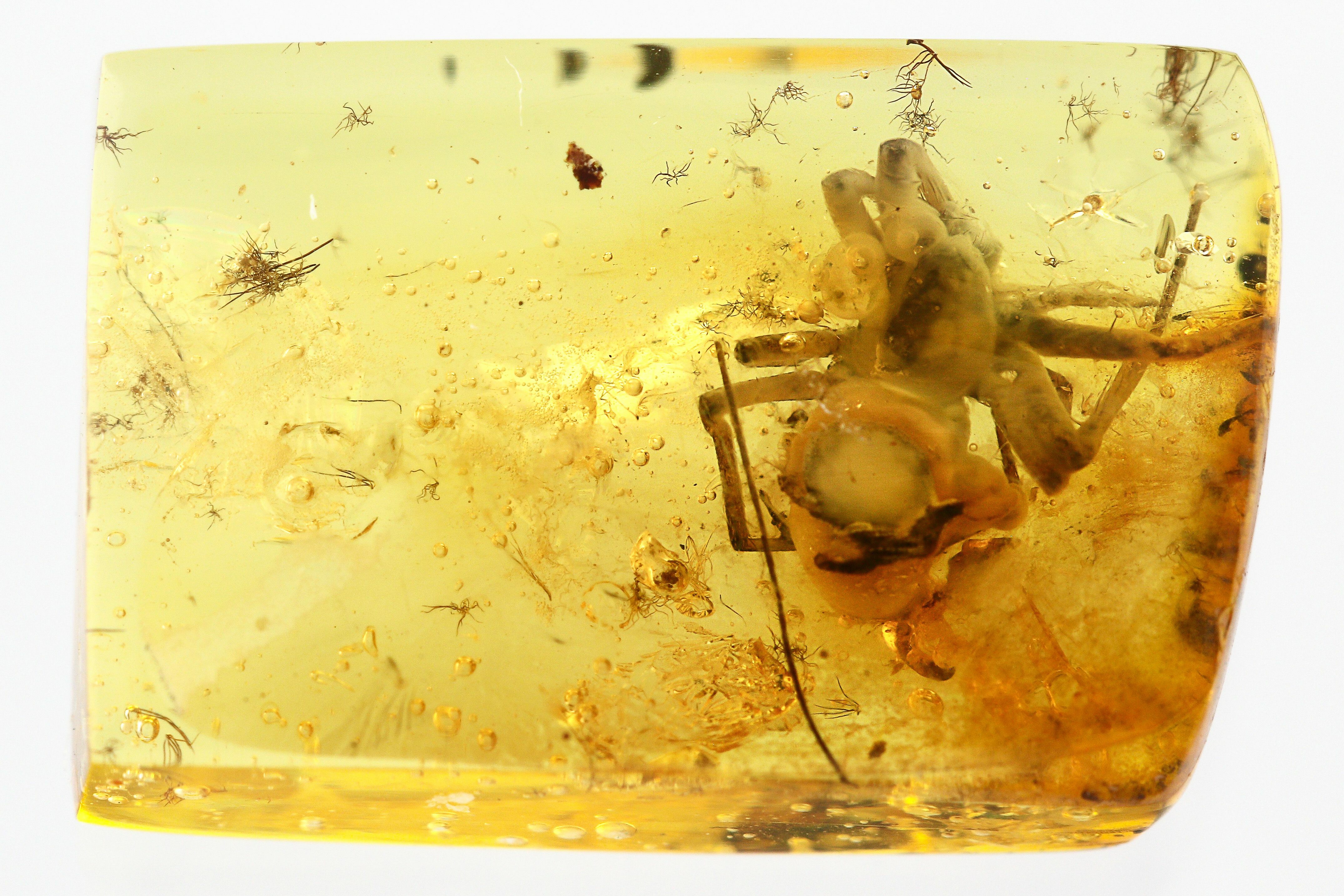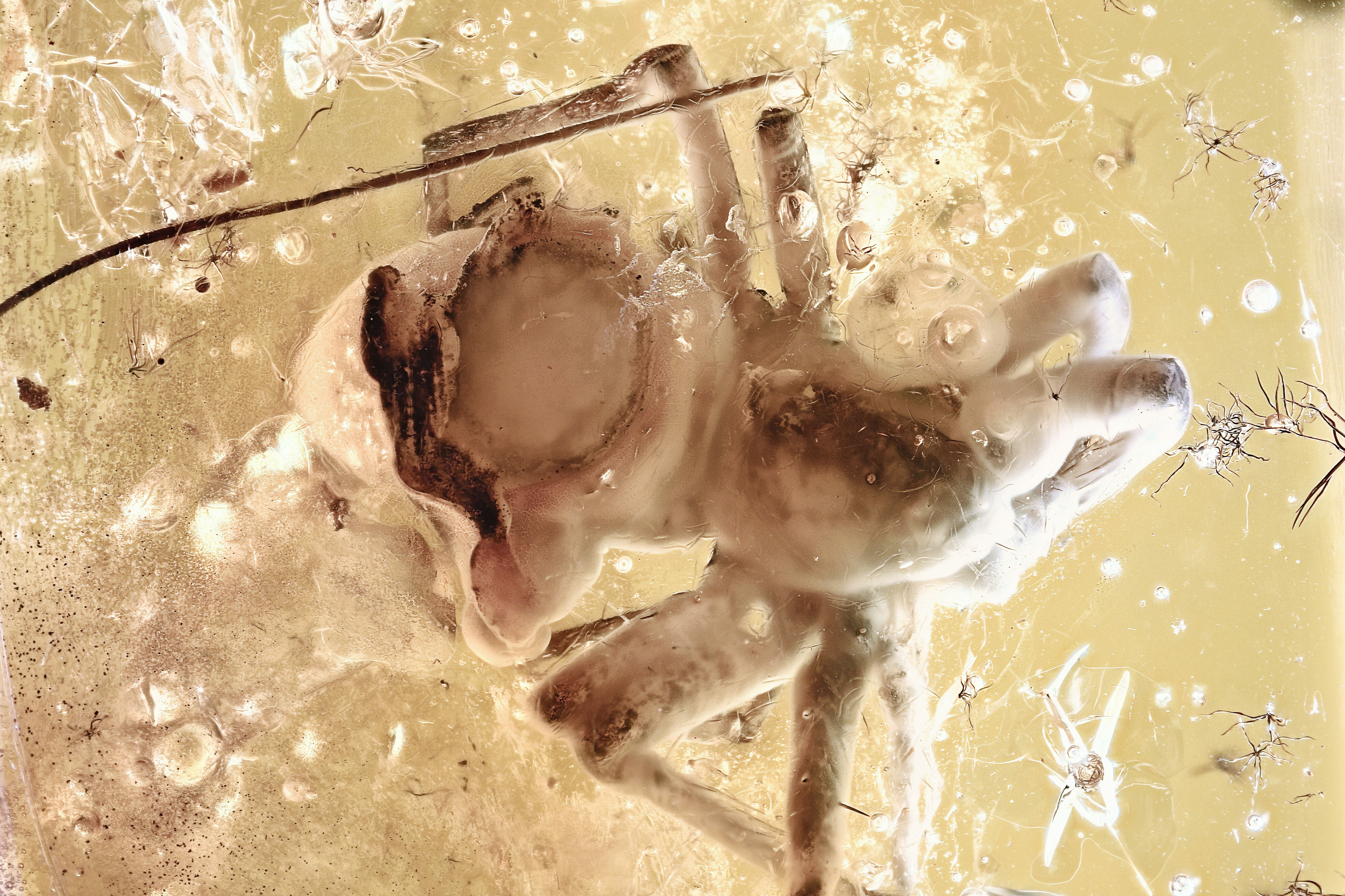 This is a relatively large and detailed fossil spider (order Araneae) preserved in Baltic amber. This inclusion measures about 7.5mm wide (including appendages) in a 15 x 10 x 4mm piece of amber.