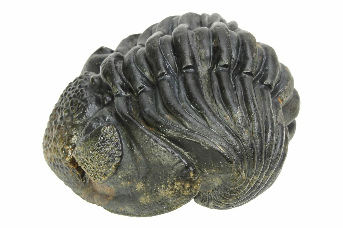 This is a large, enrolled specimen of Pedinopariops (Hypsipariops) vagabundus from Mrakib, Morocco. It has been completely removed from the limestone it was found in and has nice eye facet preservation in both eyes. It is 2.4" wide and would be about 4.5" long if outstretched making if very large for the species. It has about 3% shell restoration in total.