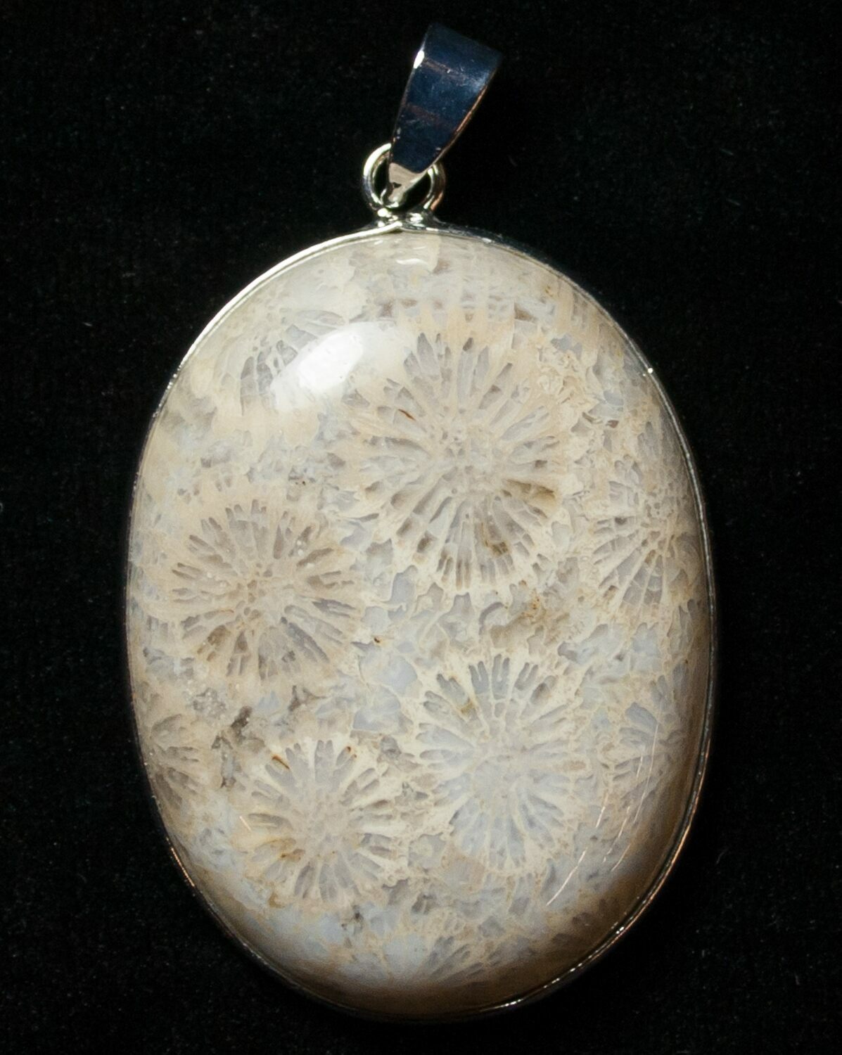 This is a pendant made from agatized, fossil coral from Sumatra, Indonesia. The polishing allows the beautiful, fossilized structure of the coral heads to easily be seen.