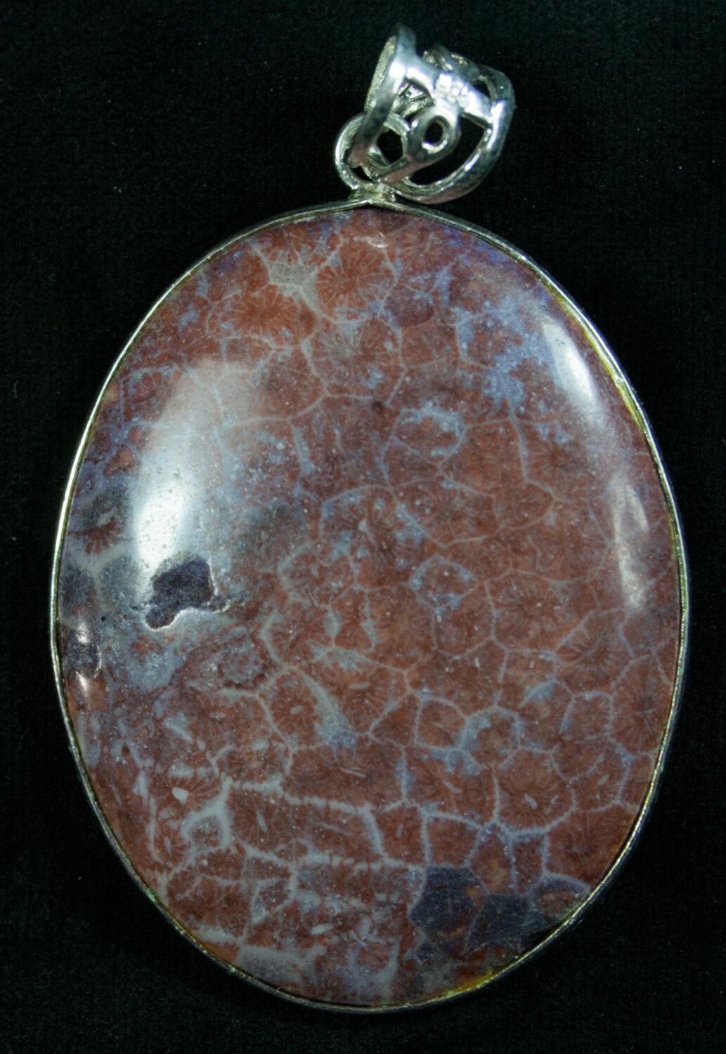 This is a pendant made from agatized, fossil coral from Sumatra, Indonesia. The polishing allows the beautiful, fossilized structure of the coral heads to easily be seen.