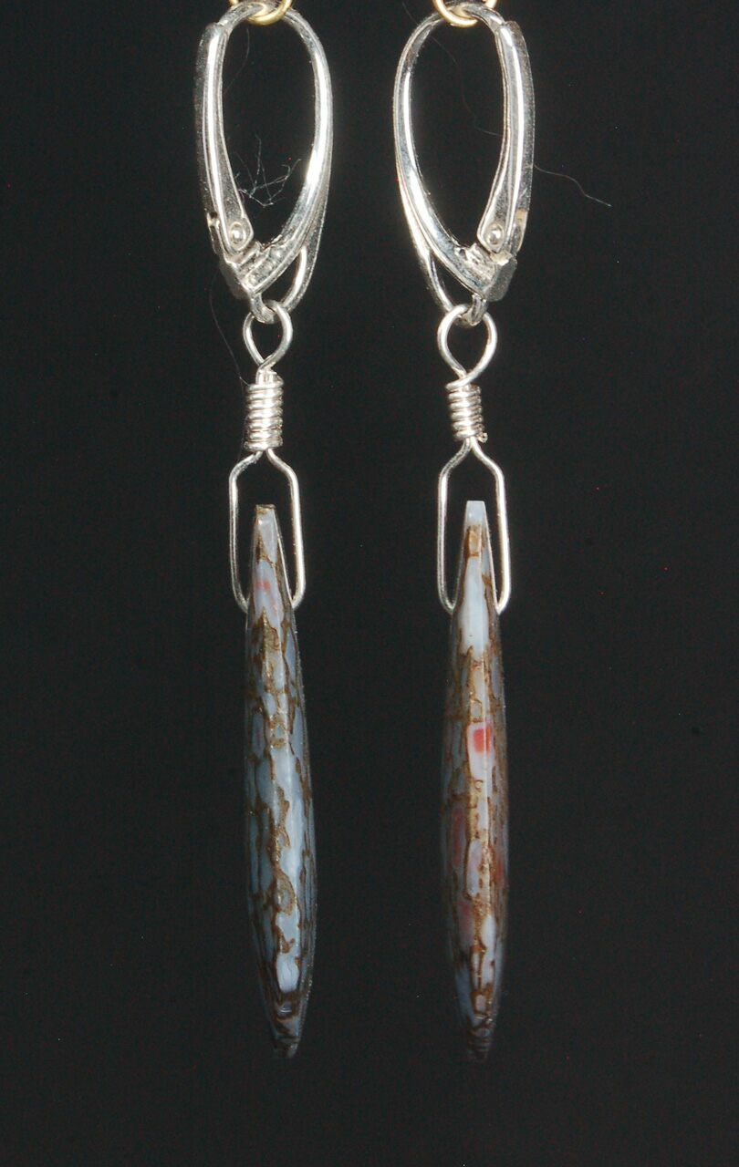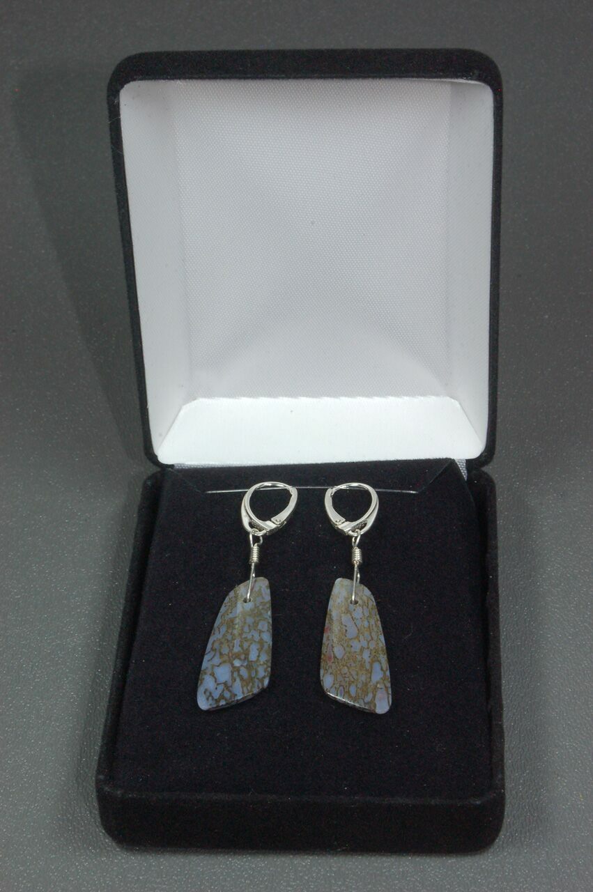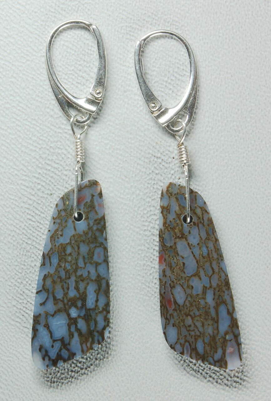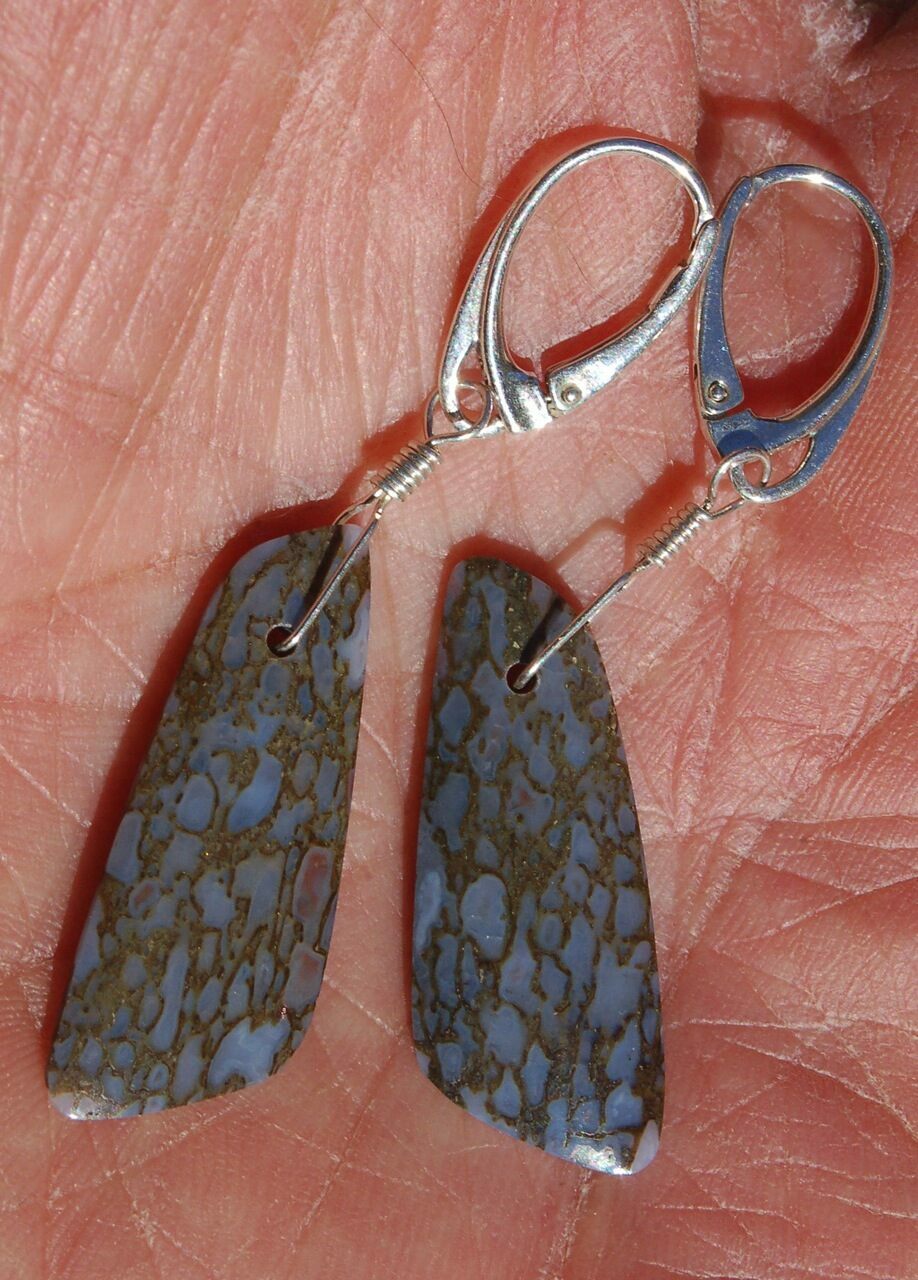 This is a pair beautiful, trapazoidal shaped earrings hand crafted from 150 million year old, powder blue, agatized dinosaur bone (gembone) by master stone craftsman, Kenneth Kolb. The amazingly agatized cell structure of the bone creates fantastic patterns when polished. Top quality gem bone used with a medium cell sized cell structure, with sterling silver wrap and lever back findings.