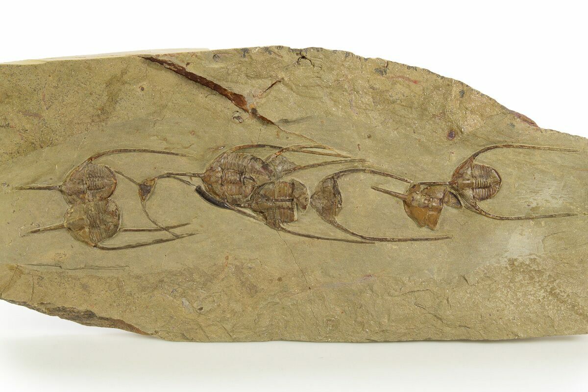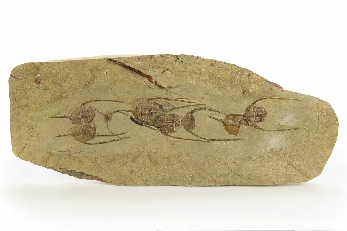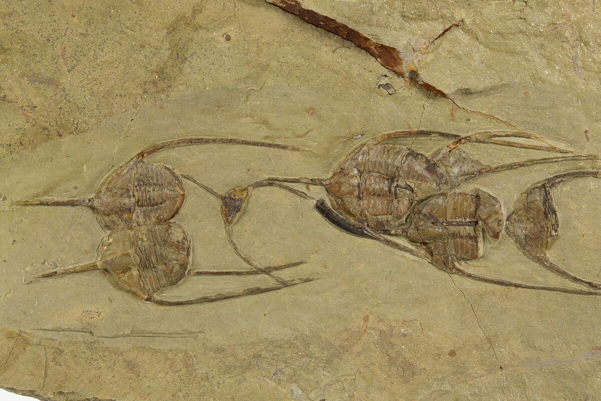 This is a really cool trilobite plate. It contains a line of four complete Lonchodomas trilobites and a couple partials, collected from the Lower Fezouata Formation of Morocco. It has been hypothesized that the lines of trilobites from this locality might represent migratory behavior. A paper was published a couple years back, describing similar fossils from this same locality.